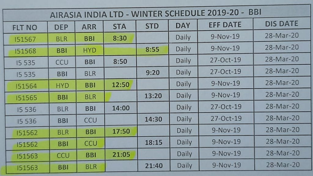 The winter schedule of AirAsia domestic flights to and from Bhubaneswar is as follows: