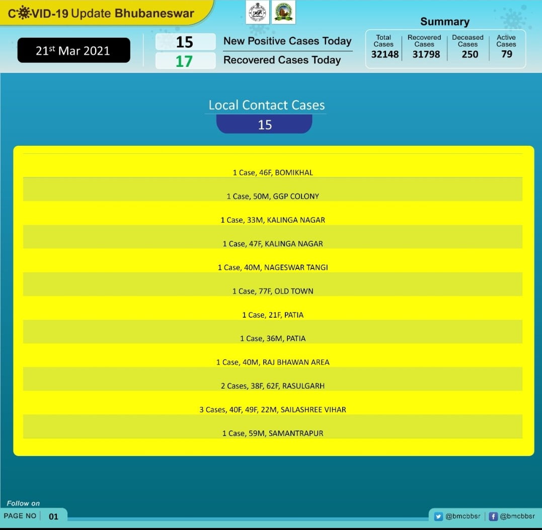 Bhubaneswar: The capital city saw 15 new COVID-19 positive cases in the last 24 hours.