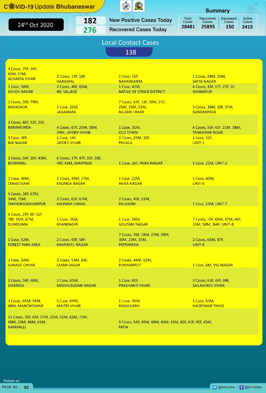 According to Bhubaneswar Municipal Corporation (BMC), 44 are quarantine and 138 local contact cases.