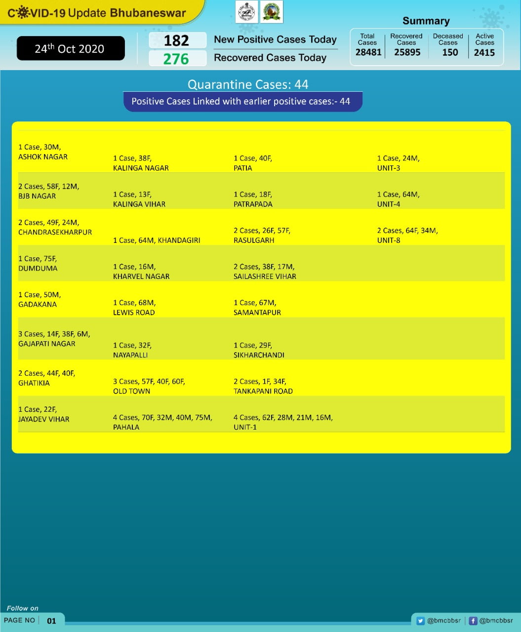 According to Bhubaneswar Municipal Corporation (BMC), 44 are quarantine and 138 local contact cases.