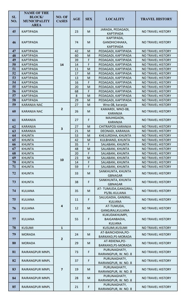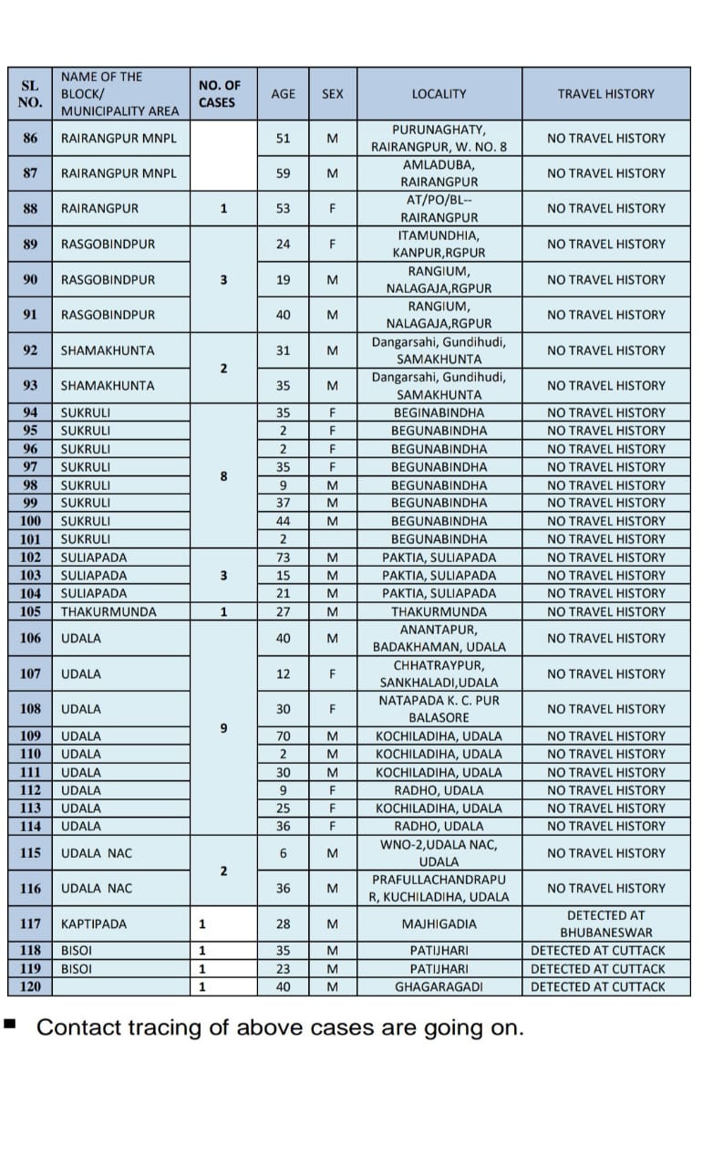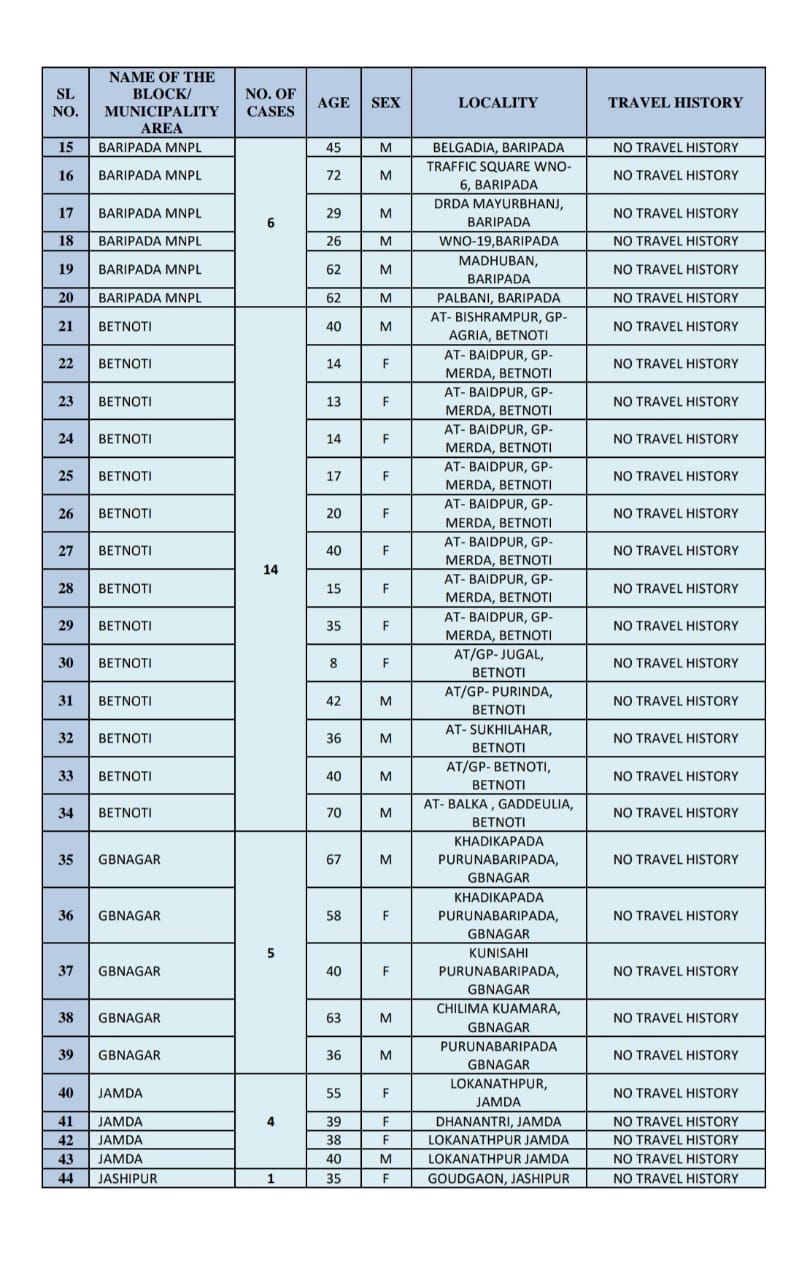The highest of 14 cases each were reported from Betnoti and Kaptipada blocks, followed by 10 in Khunta block, nine in Udala block, eight in Sukruli block, seven each in Bahalda and Rairangpur municipality, six in Baripada municipality, five each in Badasahi and GB Nagar blocks, four each in Jamda and Kuliana blocks, three each in Karanjia, Rasgovindpur and Suliapada blocks, two each in Bangiriposi, Morada and Shamakunta blocks, Karanjia NAC and Udala NAC, one case each in Jashipur, Kusumi, Rairangpur and Thakurmunda blocks.