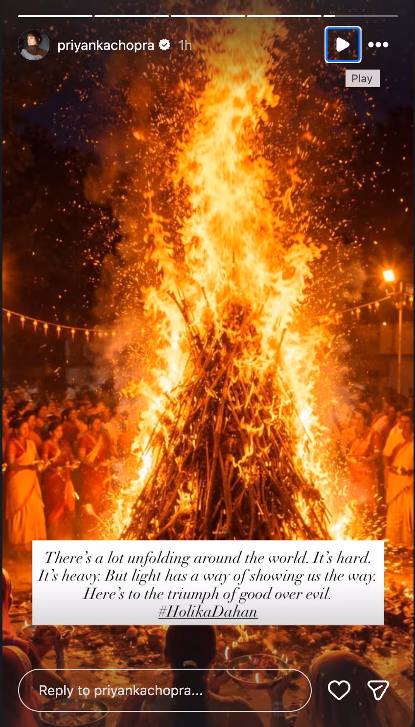 Taking to her Instagram handle, Priyanka shared a photograph of people celebrating Holika Dahan and wrote, “There’s a lot unfolding around the world. It’s hard. It’s heavy. But light has a way of showing us the way. Here’s to the triumph of good over evil. #HolikaDahan.”