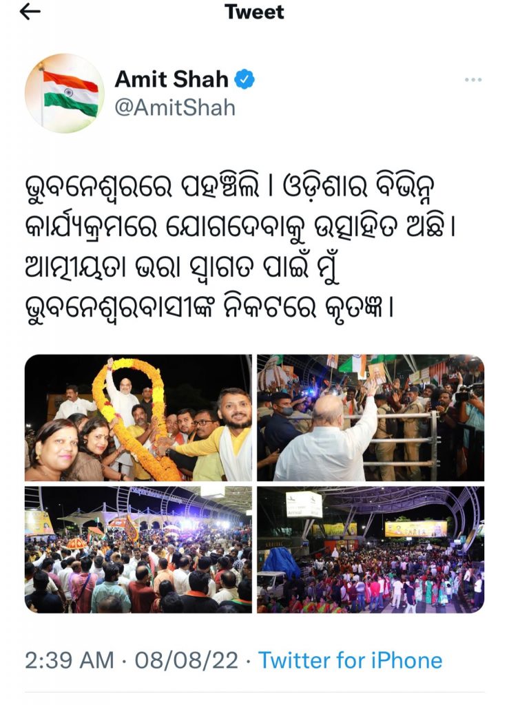 After arriving, he tweeted, “Looking forward to attending various programs in Odisha. I am grateful to the people of Bhubaneswar for the warm welcome.” Elaborate security arrangements were put in place on the stretch of the road leading to a private hotel in Jaydev Vihar, where Shah is staying.