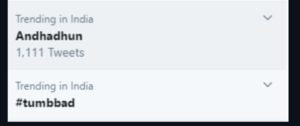 Twitter witnessed an online battle for the top slot between ‘Andhadun’ and ‘Tumbbad’. On Tuesday, the names of these movies were suddenly among the top trends on Twitter in India, with them being listed as ‘masterpiece’ watched in the last four to five years.