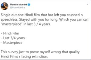 This all started when producer Manish Mundra asked the Twitteratis to “single out one Hindi film that has left one stunned and speechless… . which one can call ‘masterpiece’ in the last ¾ years”.