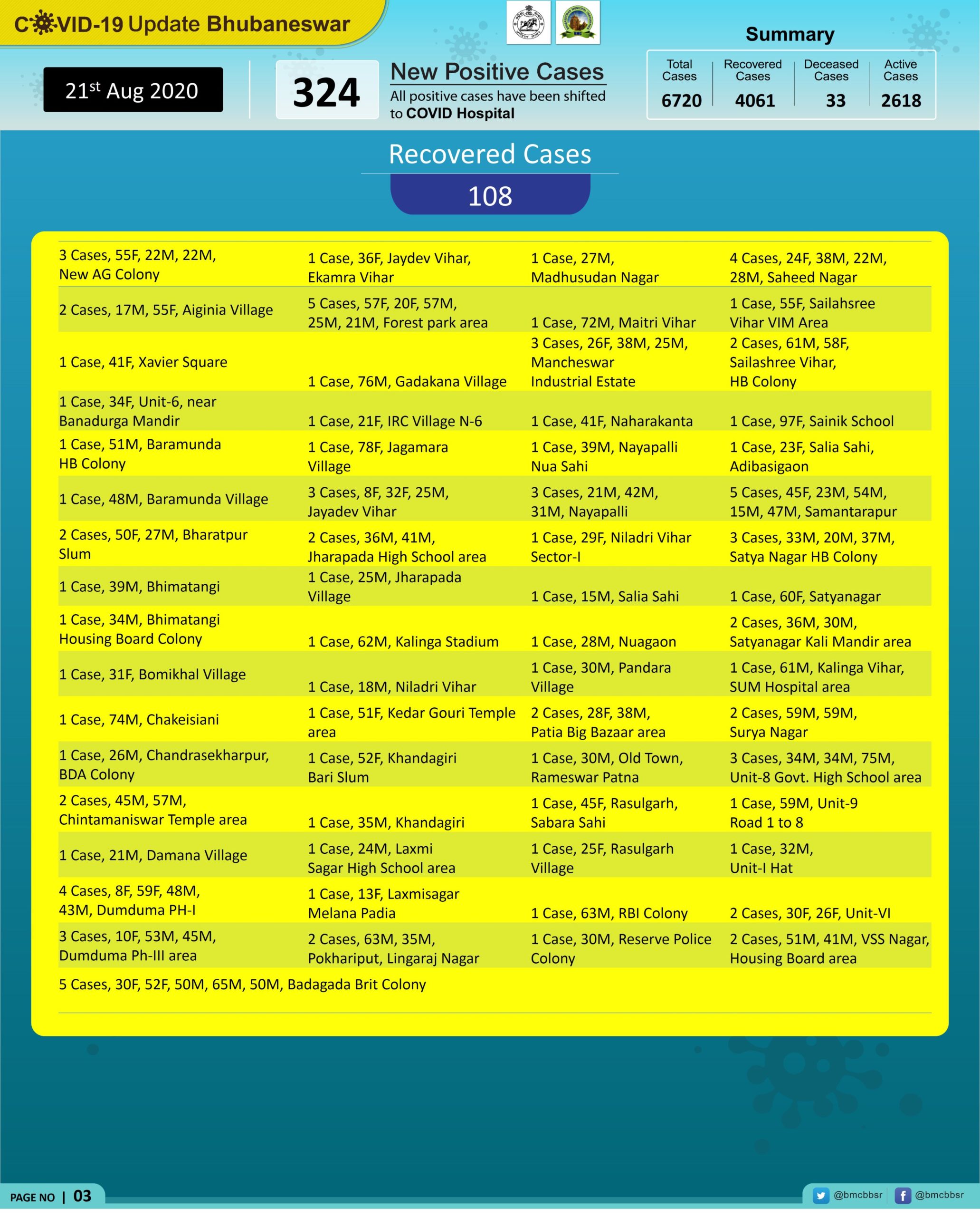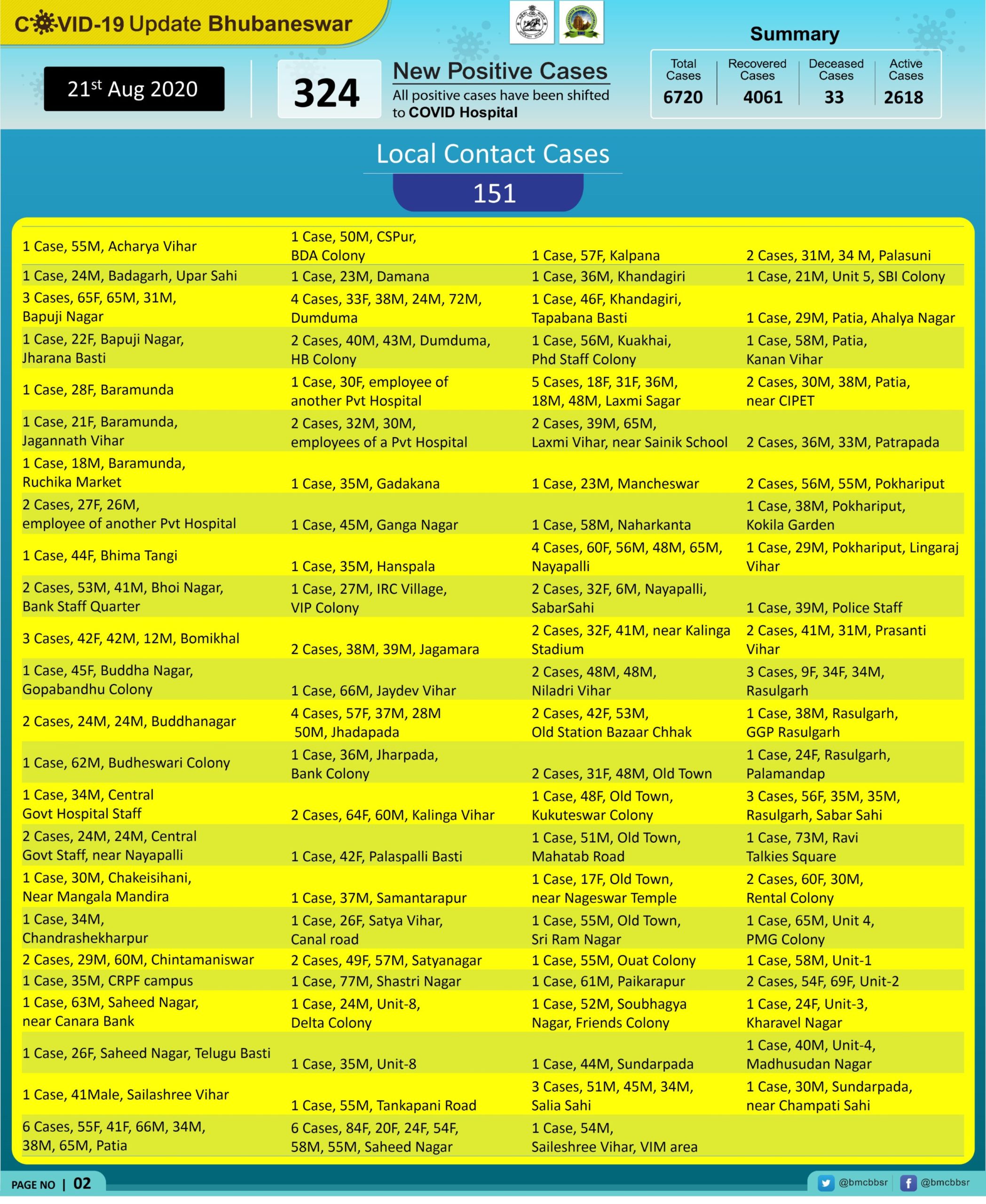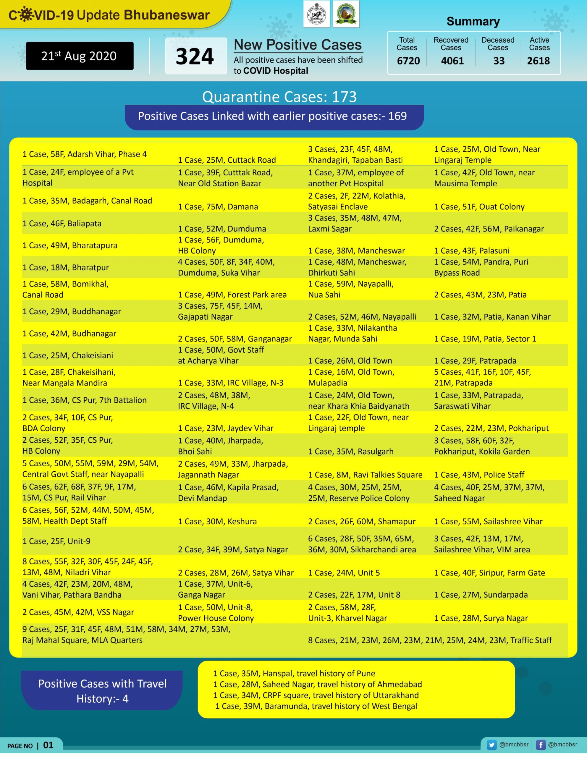 With 33 deaths and 4061 recoveries, Bhubaneswar now has 2618 active cases.
