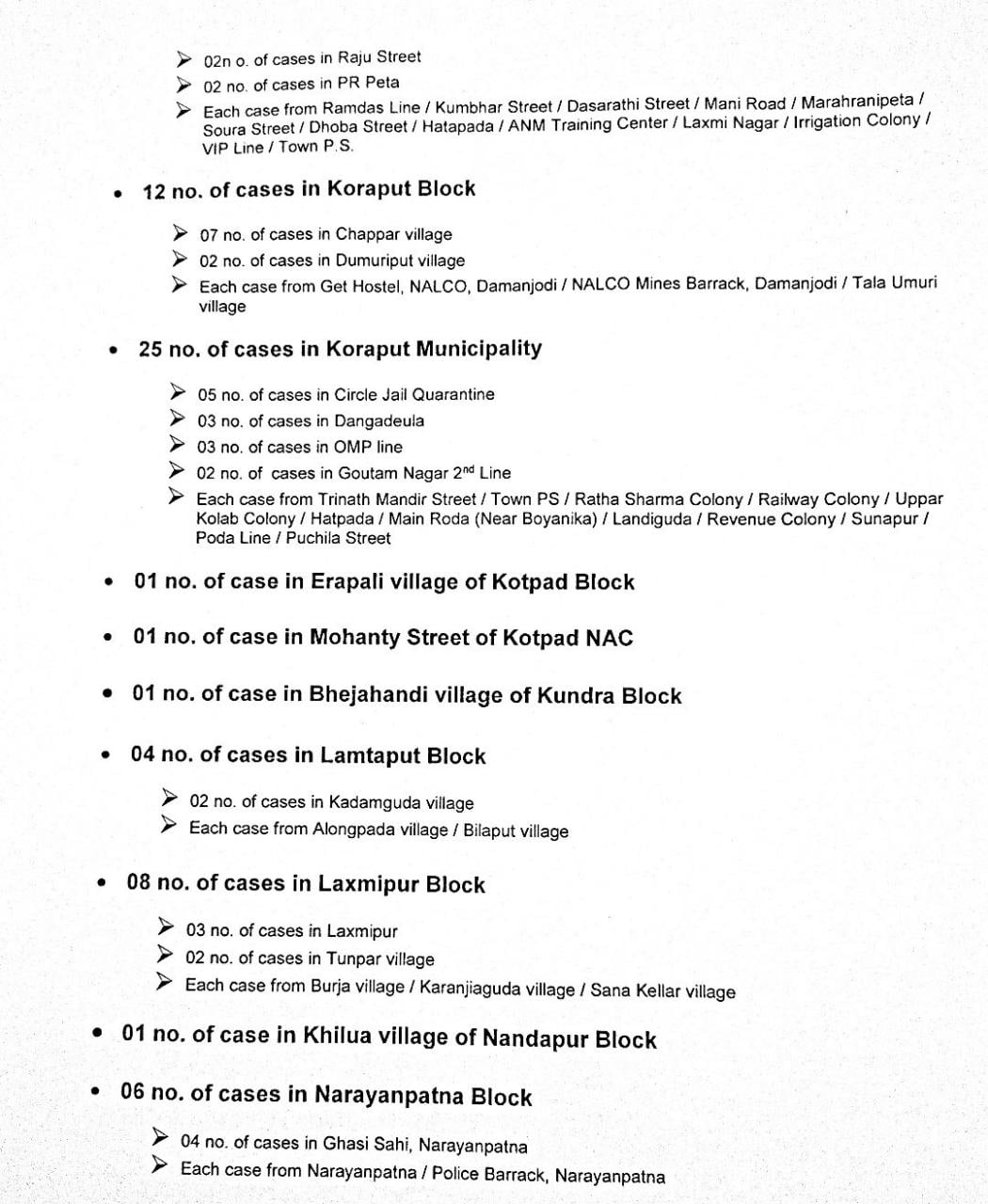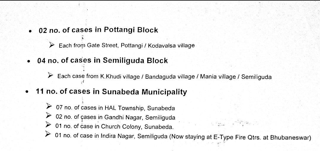 The highest of 41 cases have been reported from Jeypore municipality, followed by 25 Koraput municipality,  12 were from Koraput block, 11 from Sunabeda, eight from Laxmipur block, seven from Bandhugaon, six from Narayanpatna, four each from Jeypore block, Semiliguda and Lamtaput, three from Boipariguda, two from Pottangi, and one each from Dasmantapur, Kotpad, Kotpad NAC, Kundra, and Nandapur.