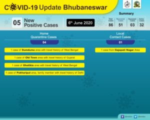 Four of the new cases in the Odisha capital were under home quarantine in Dumduma, Pokhariput, Old Town and Ghatikia areas, with recent travel history. The fifth case is from Gajapati Nagar, under local contact.