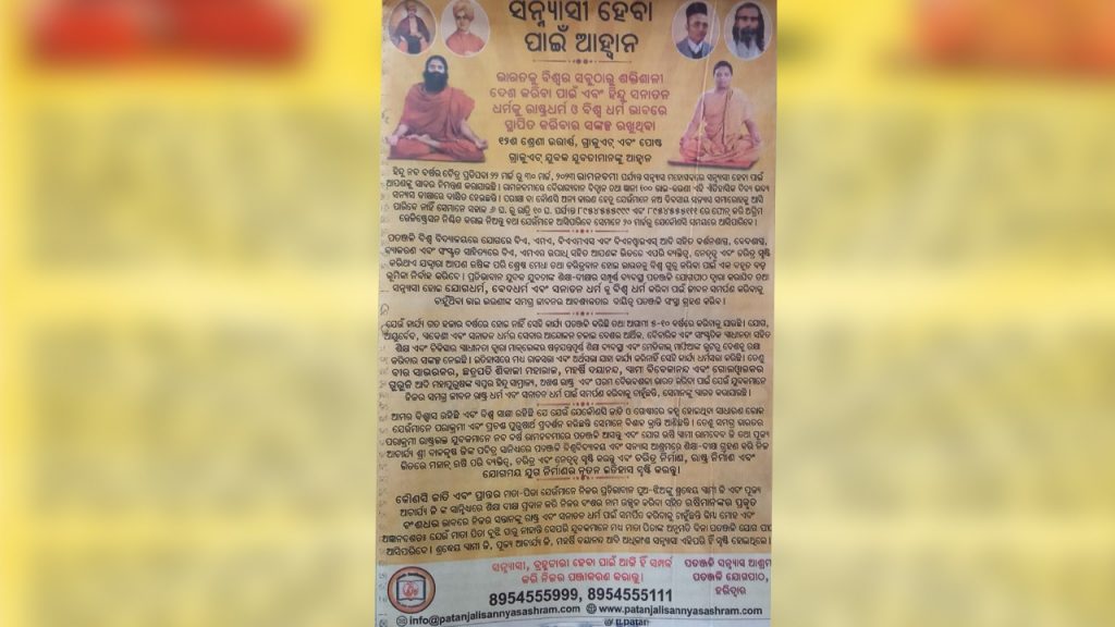 Bhubaneswar: Patanjali Yogpeeth of Baba Ramdev has issued an advertisement inviting young people to join a programme for becoming ‘Sanyasis’. Those who have passed class XII examination or are graduates and postgraduates are eligible to enroll in the programme.
