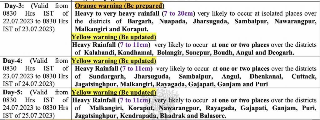 Bhubaneswar: Light to moderate widespread rainfall with isolated heavy to very heavy falls is likely in Odisha till July 24 under the influence of strong monsoon flow and a low pressure, which lies over Northwest Bay of Bengal & adjoining Odisha coast.