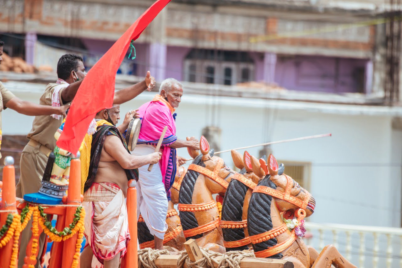 After the removal of Charamala, ‘Ghodas’ are being mounted on the chariots.