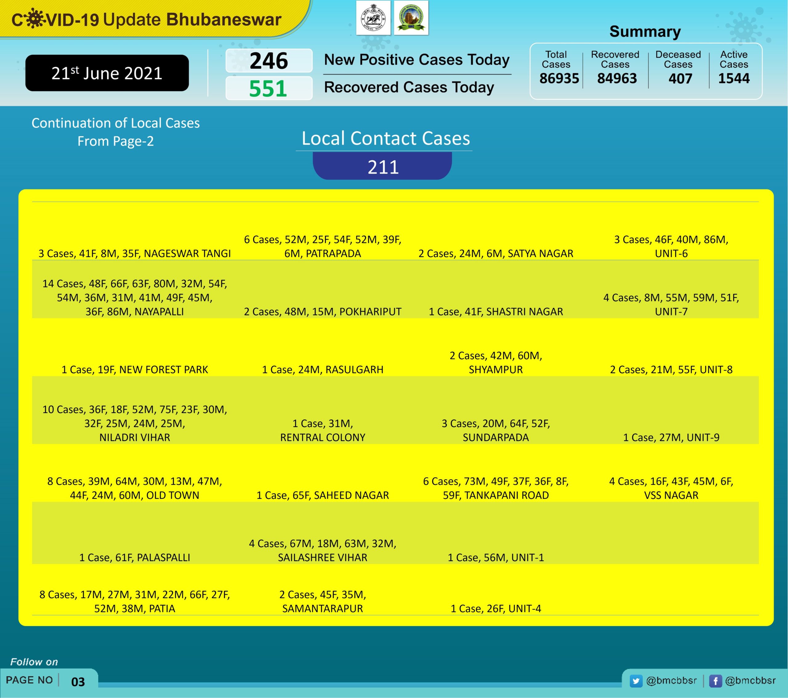 Of the new cases, 35 were from quarantine and 211 were local contacts, tweeted Bhubaneswar Municipal Corporation.