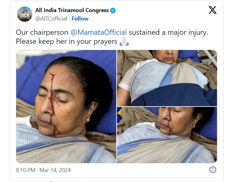 The ruling Trinamool Congress (TMC) shared the news of Mamata’s injury on X (formerly Twitter). It also posted a picture of her bleeding in forehead.