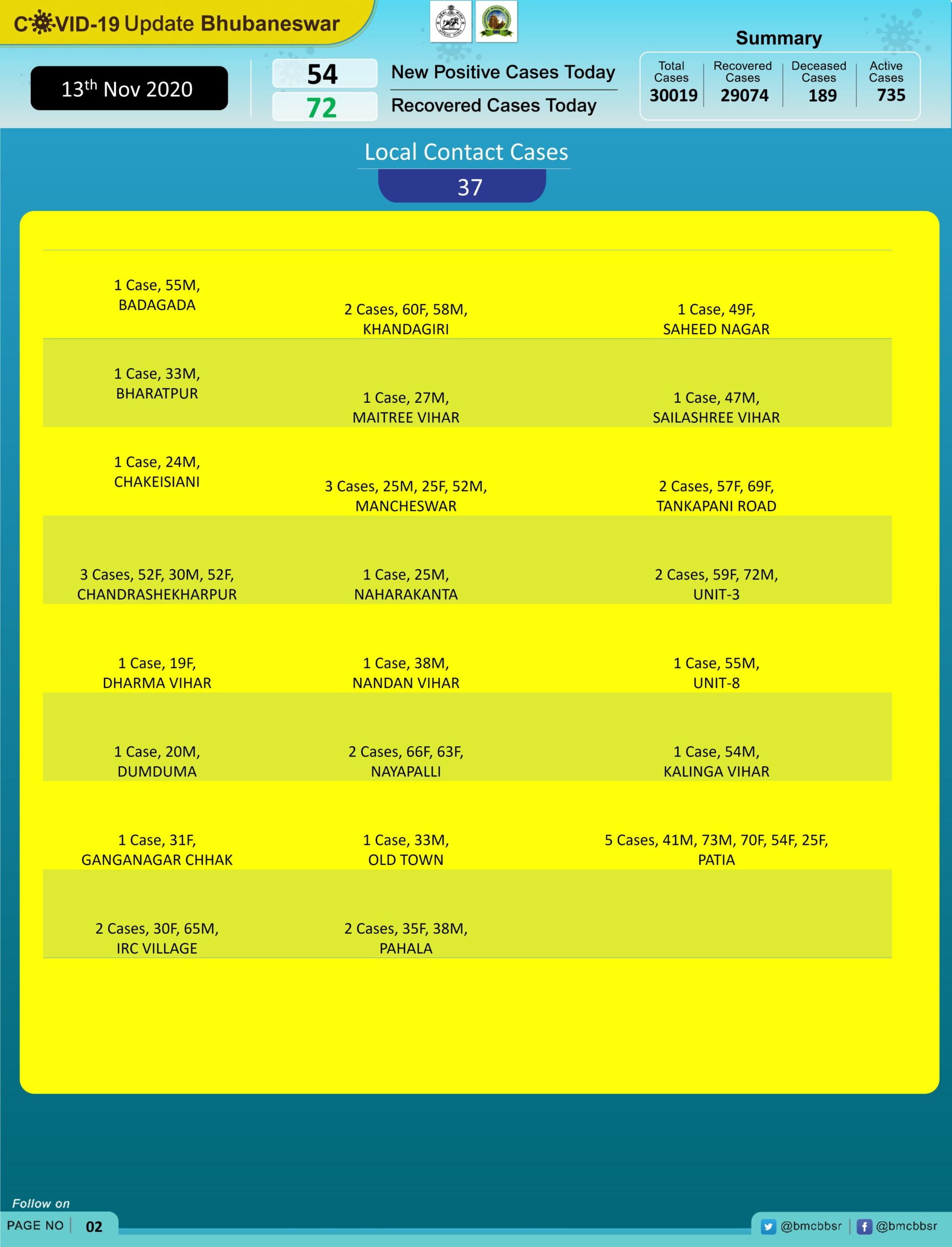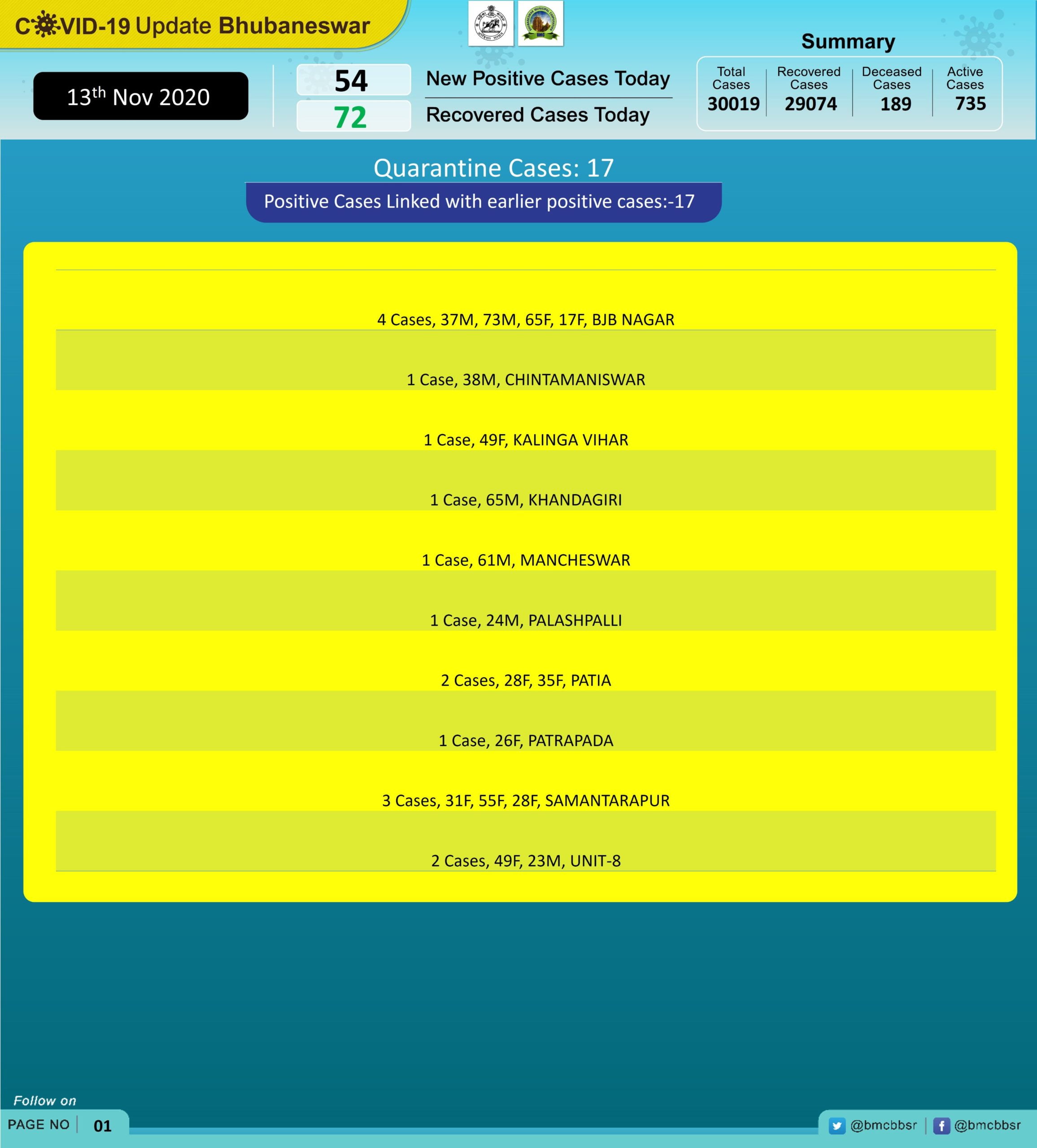 According to Bhubaneswar Municipal Corporation (BMC), 17 are quarantine and 37 local contact cases.