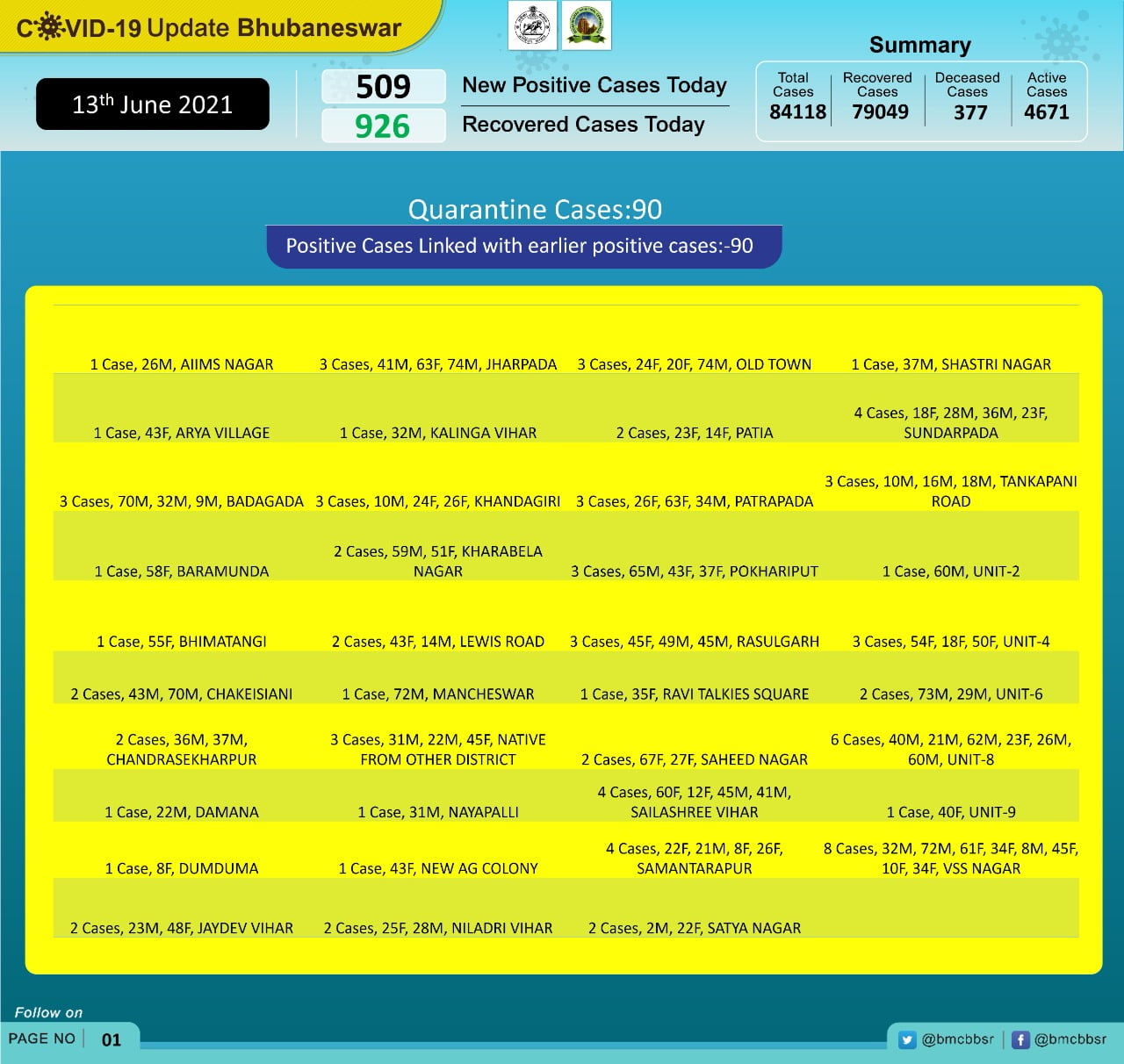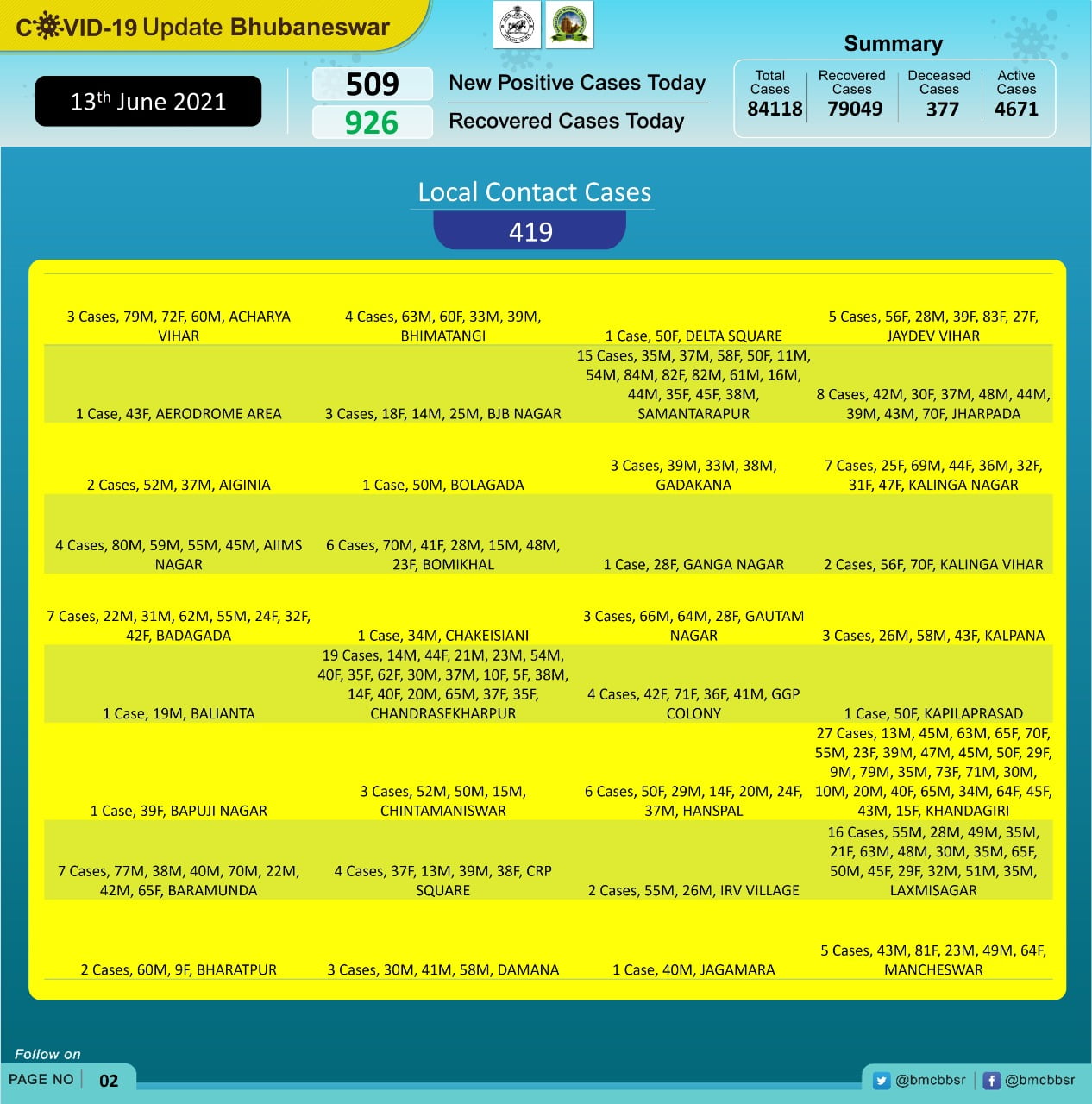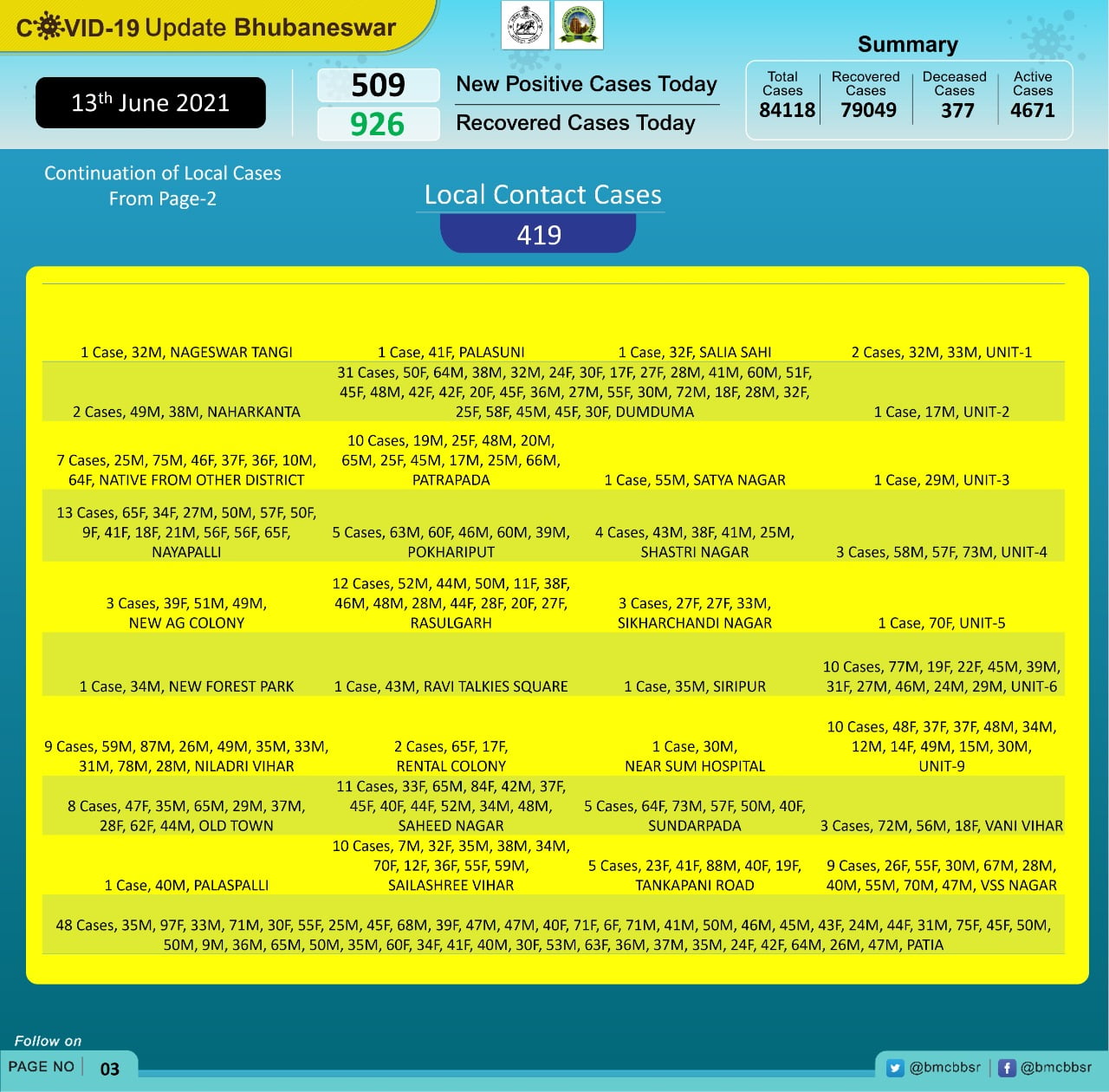 Among new cases, 90 are from quarantine and 419 through local contacts. The total number of cases in Bhubaneswar has now gone up to 84,118.