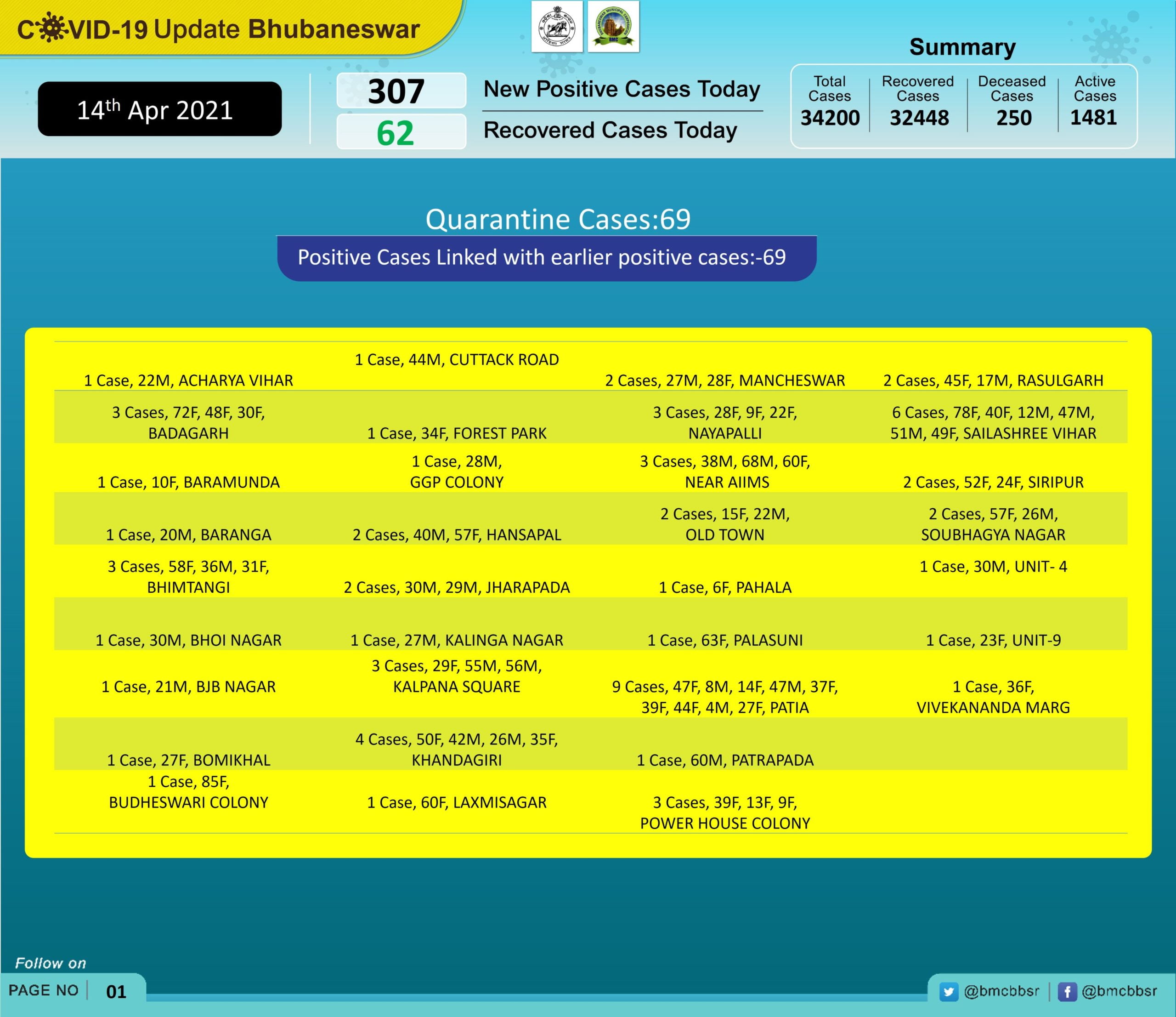 According to Bhubaneswar Municipal Corporation (BMC), 238 are local contact cases and 69 from quarantine.