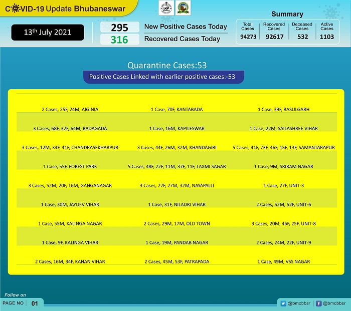 Of the new cases, 53 were from quarantine and 242 were local contacts, Bhubaneswar Municipal Corporation (BMC) stated in its tweet.