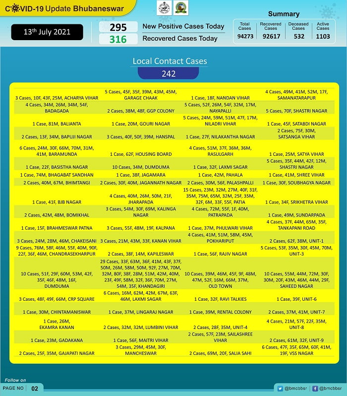 Of the local contact cases, 29 cases from Khandagiri followed by 15 from Patia, 10 each from Saheed Nagar and Old Town and 9 cases in Chandrasekhapur.