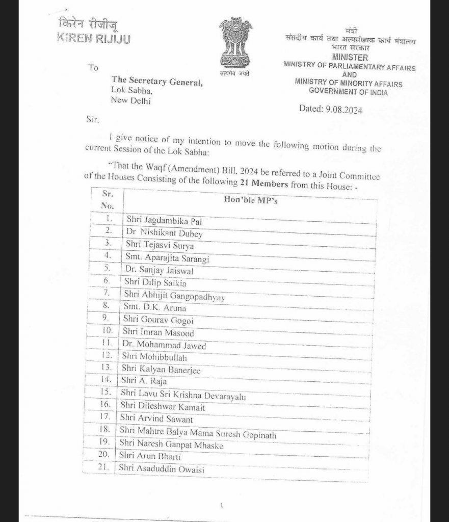 “I am honoured to be made part of the Joint Parliamentary Committee on ‘THE WAQF ( AMENDMENT) BILL, 2024’ in the Lok Sabha today,” Aparajita said in a post on X handle.