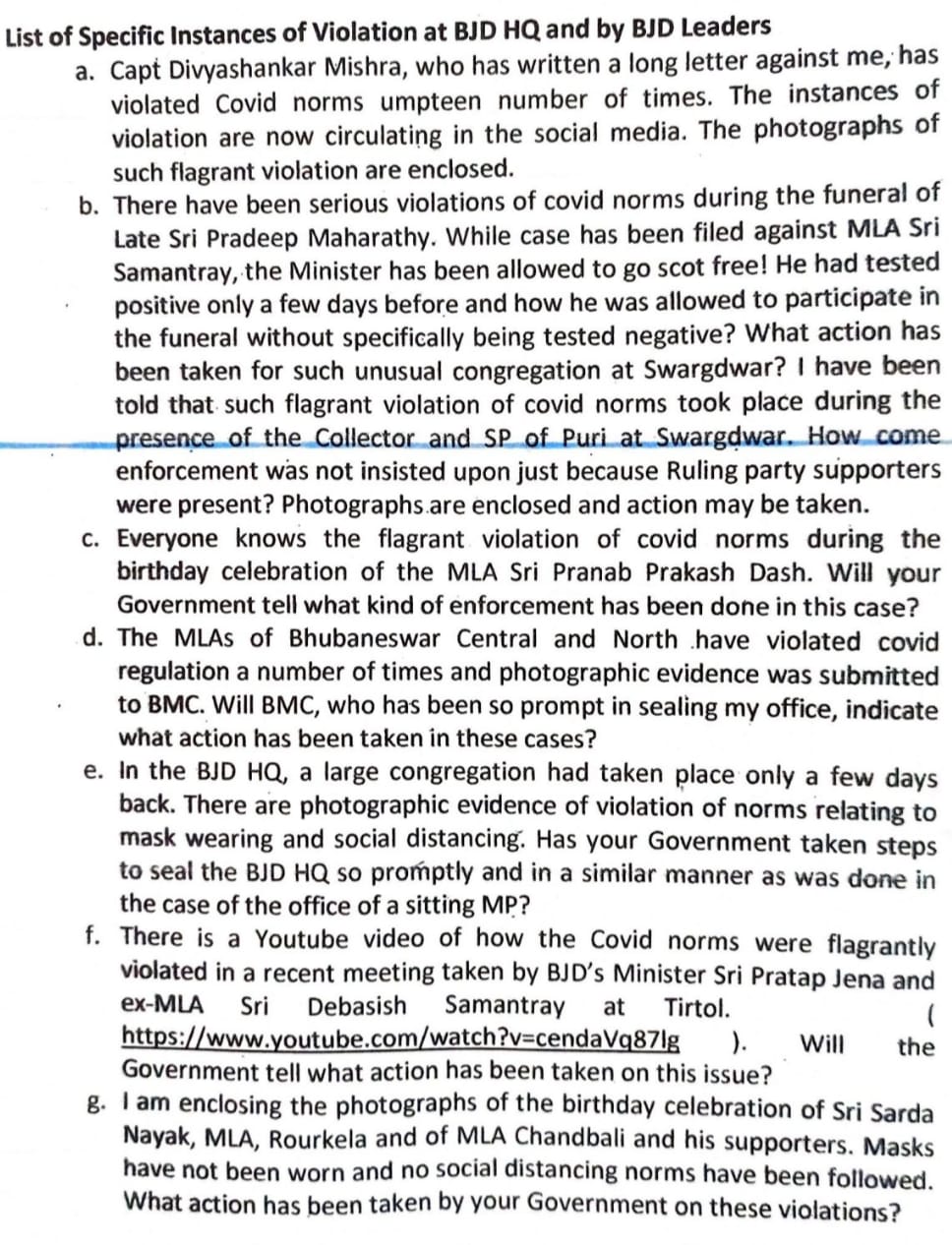 In her letter to Chief Minister Naveen Patnaik, Bhubaneswar MP on Saturday drove her point home by citing innumerable instances of violation of COVID-19 regulations at BJD party headquarters as well as by the ministers, MIAs and party workers.