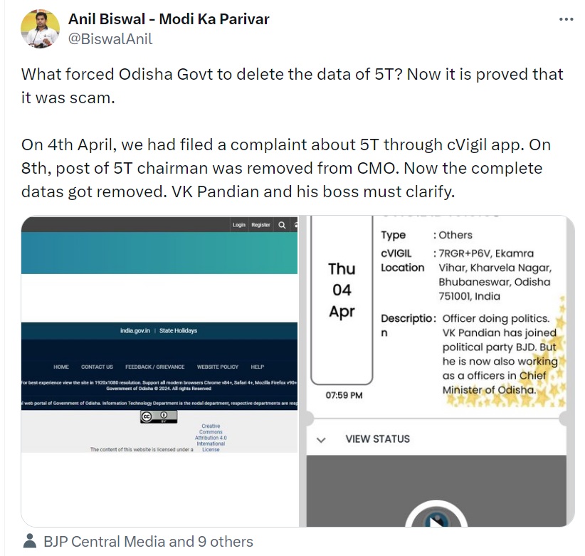 BJP spokesman Anil Biswal has also mentioned the blank page of 5T portal in X. “What forced Odisha Govt to delete the data of 5T? Now it is proved that it was scam. On 4th April, we had filed a complaint about 5T through cVigil app. On 8th, post of 5T chairman was removed from CMO. Now the complete datas got removed. VK Pandian and his boss must clarify” he wrote in the post.