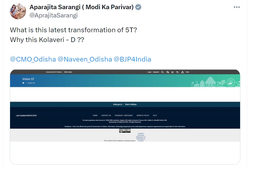 Bhubaneswar: BJP’s Bhubaneswar MP Aparajita Sarangi has targeted Odisha government on the blank VISION 5T page in its official portal.