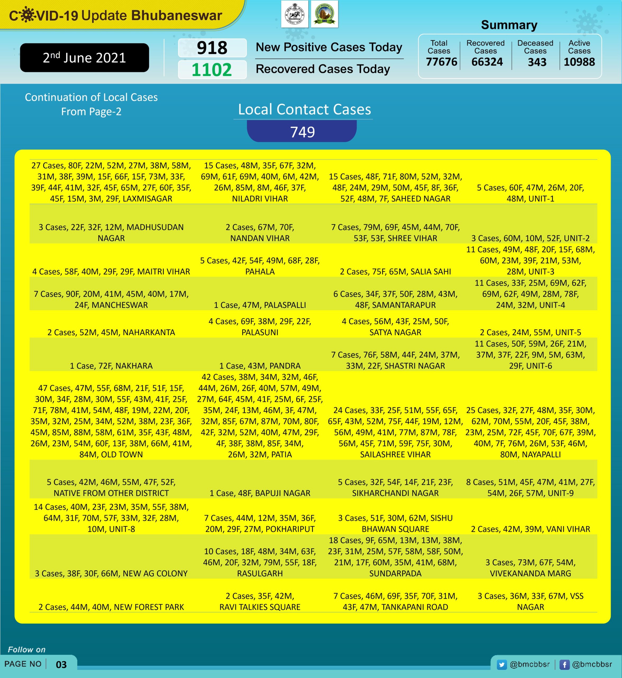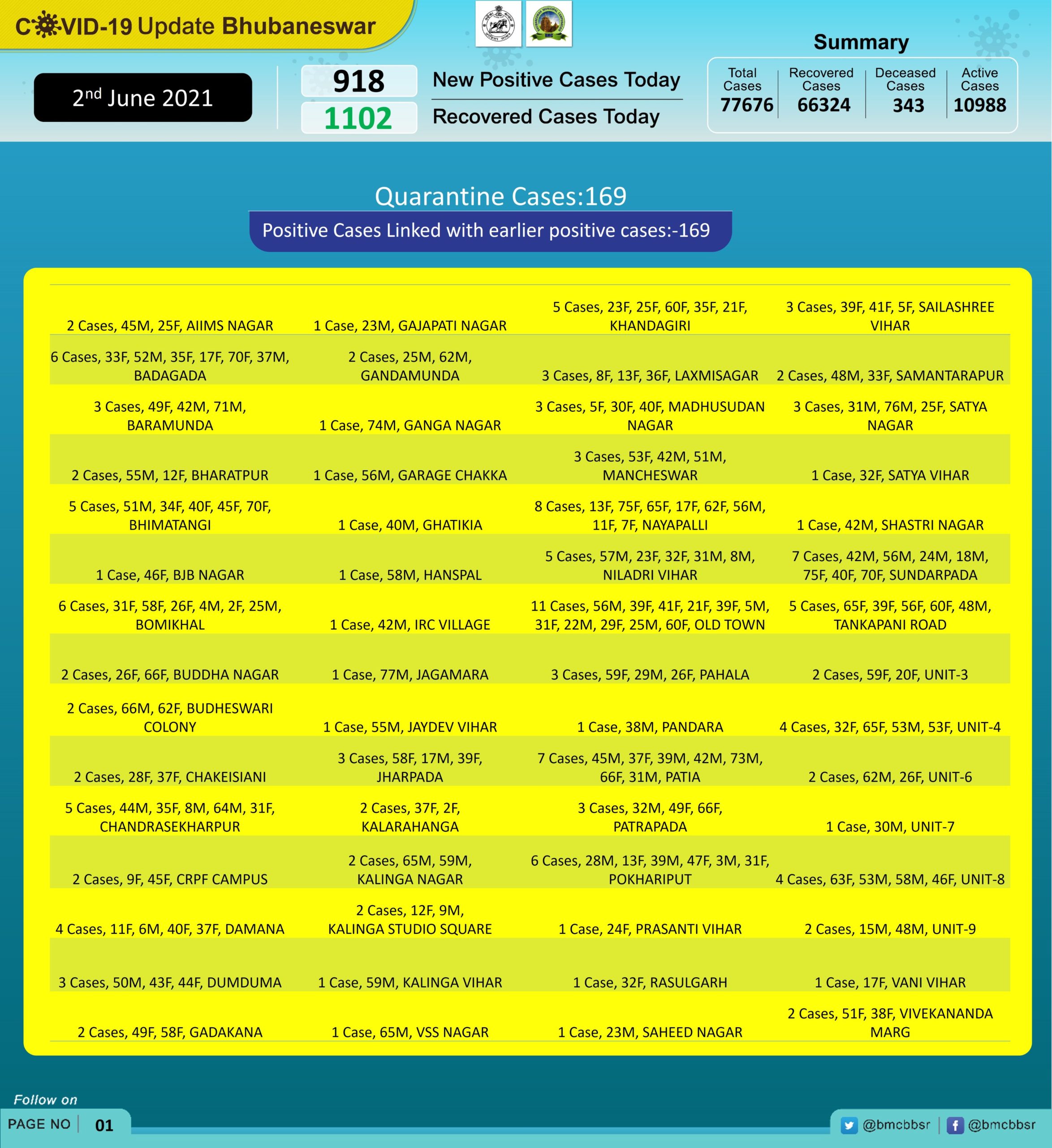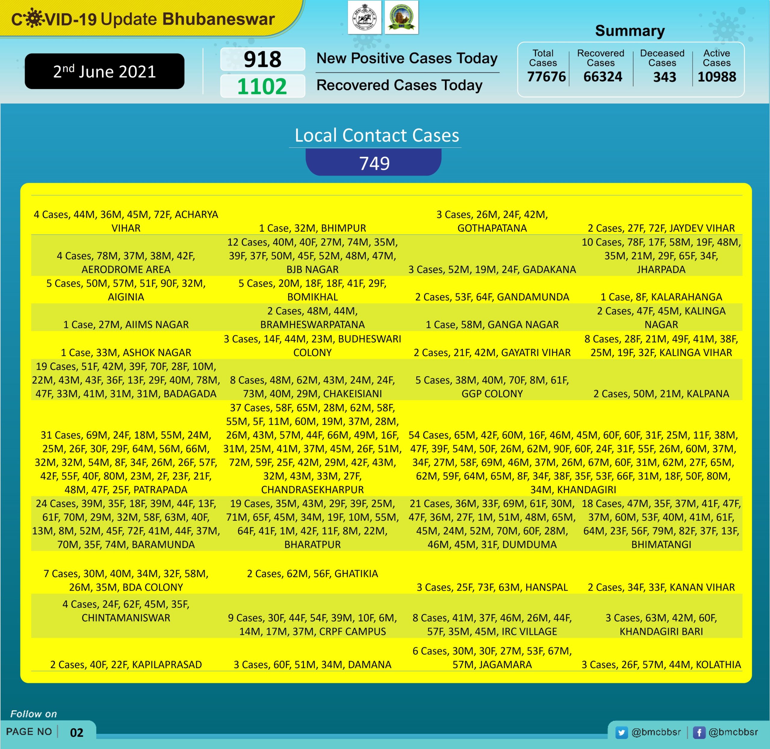 Khandagiri reported the highest of 54 cases followed by Old Town (47), Patia (42), Chandrasekharpur (37), Patrapada (31), Laxmisagar (27), Nayapalli (25), Baramunda and Sailashree Vihar (24 each), Dumduma (21).