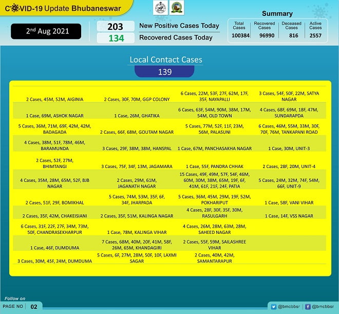 Of the new cases registered during the period, 64 were from quarantine and 139 local contacts, according to Bhubaneswar Municipal Corporation (BMC).
