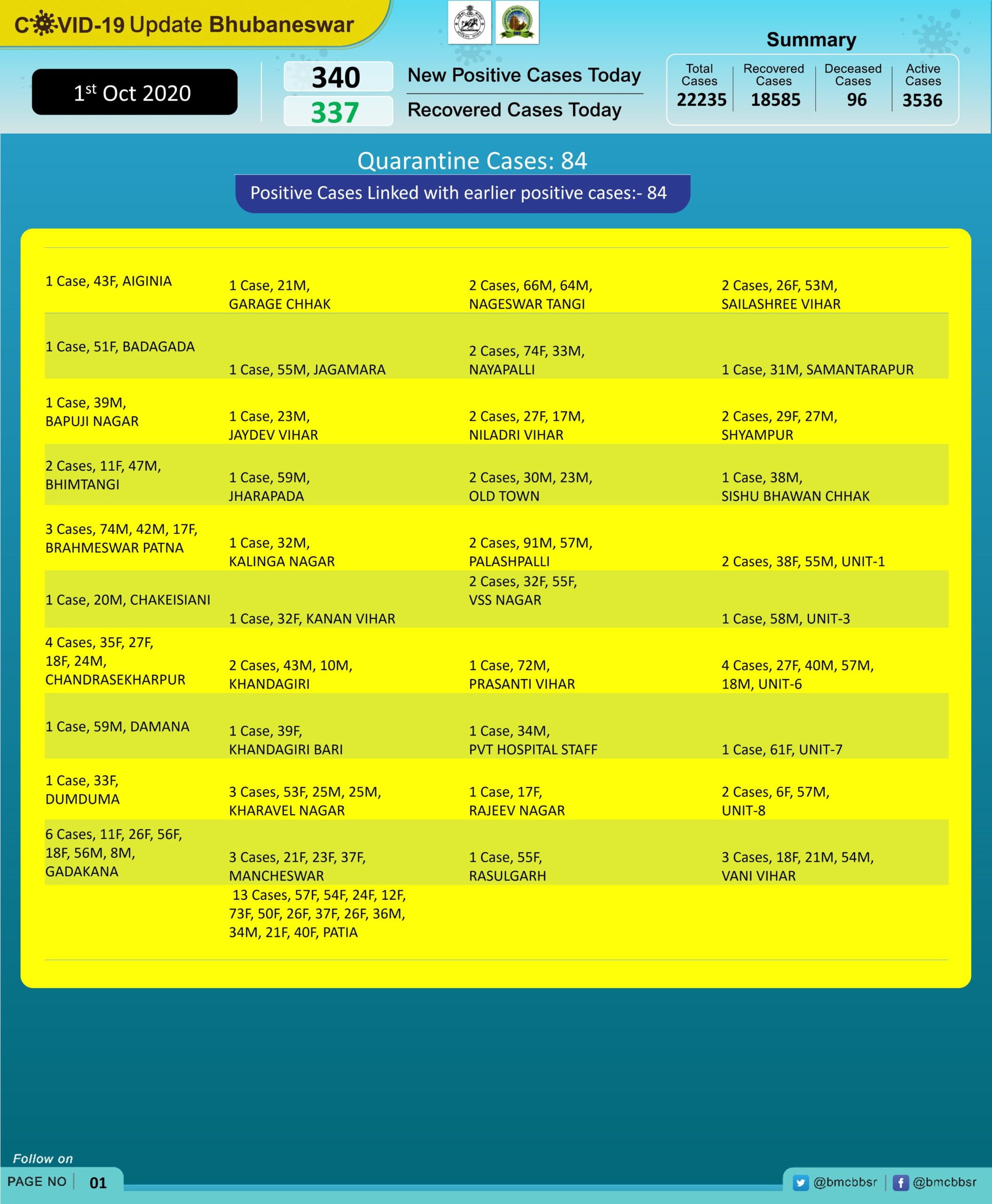 According to Bhubaneswar Municipal Corporation (BMC), 256 (75 per cent) are related to local transmission from unknown sources and 84 detected among those in quarantine.