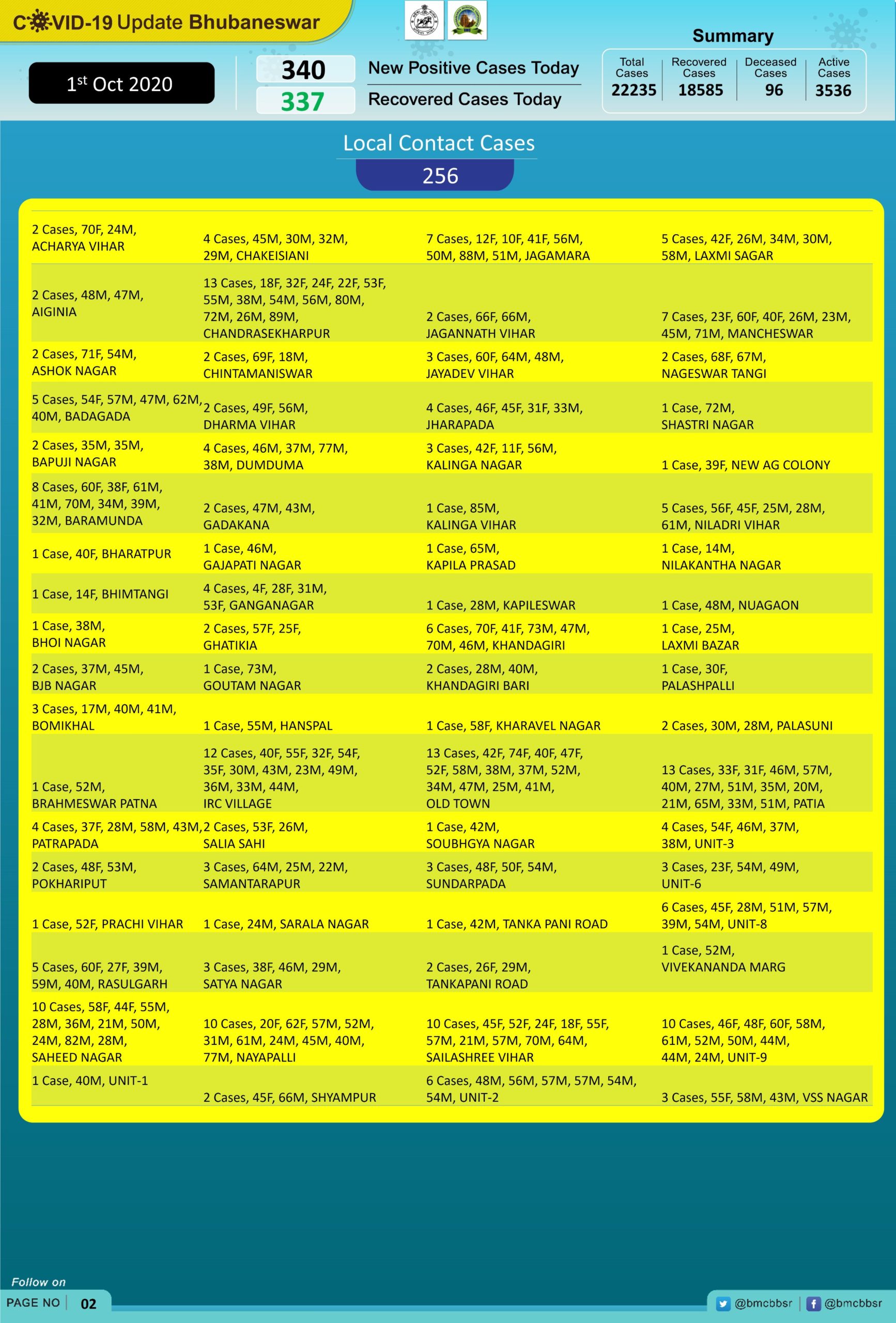 The local contact cases include 13 from Chandrasekharpur and 10 each from Saheed Nagar, Nayapalli, Sailashree Vihar and Unit 9.