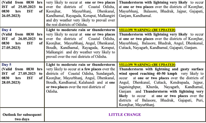 The MeT office has also issued yellow warning for thunderstorm with lightning and gusty surface wind speed reaching 40-50 kmph in some districts till May 27. There is also a forecast for light to moderate rain at most places across the state on all these days. The coastal belt is also witnessing a sudden drop in the mercury level late afternoon with sea-triggered cooler wind making the evenings pleasant after a sultry day. The IMD has attributed it to southerly wind and moisture in the environment in the evening.