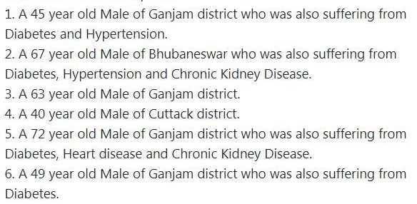 Bhubaneswar: The coronavirus has claimed six more lives in Odisha in the last 24 hours, taking the toll to 70 on Monday.