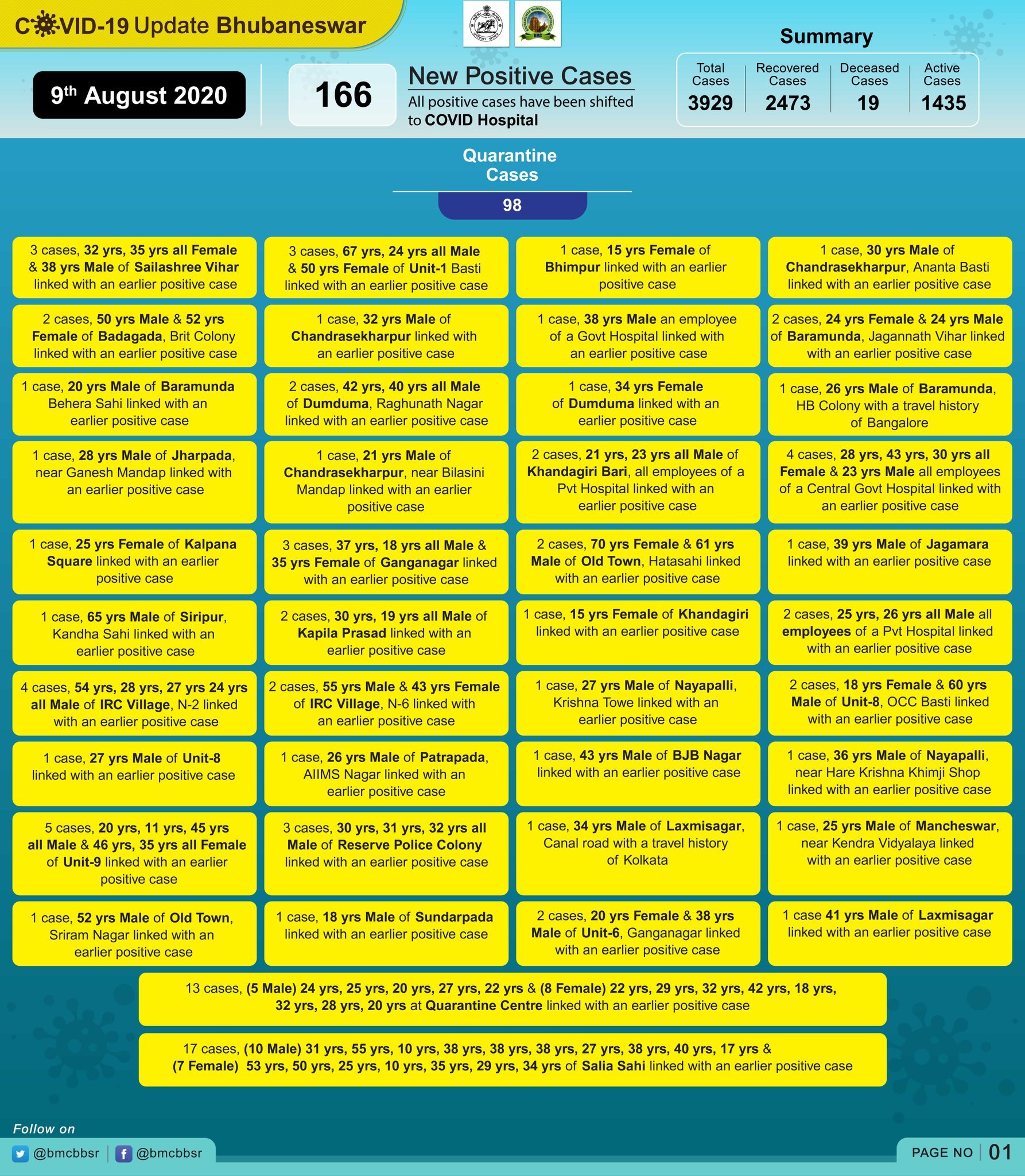Among them, 98 are quarantine cases and 68 local contact cases, the Bhubaneswar Municipal Corporation (BMC) tweeted.