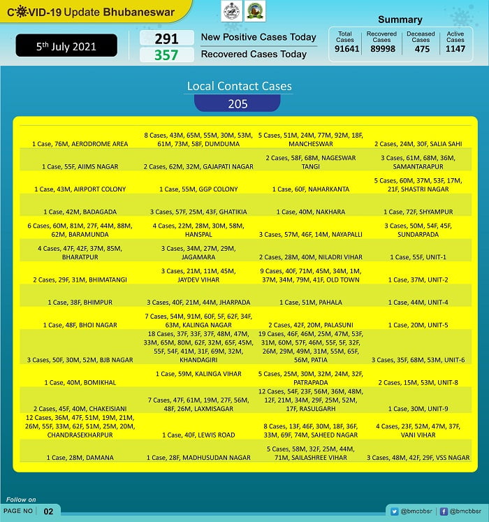 Of the new cases on the day, 86 were from quarantine and 205 were local contacts, Bhubaneswar Municipal Corporation (BMC) stated in its tweet.
