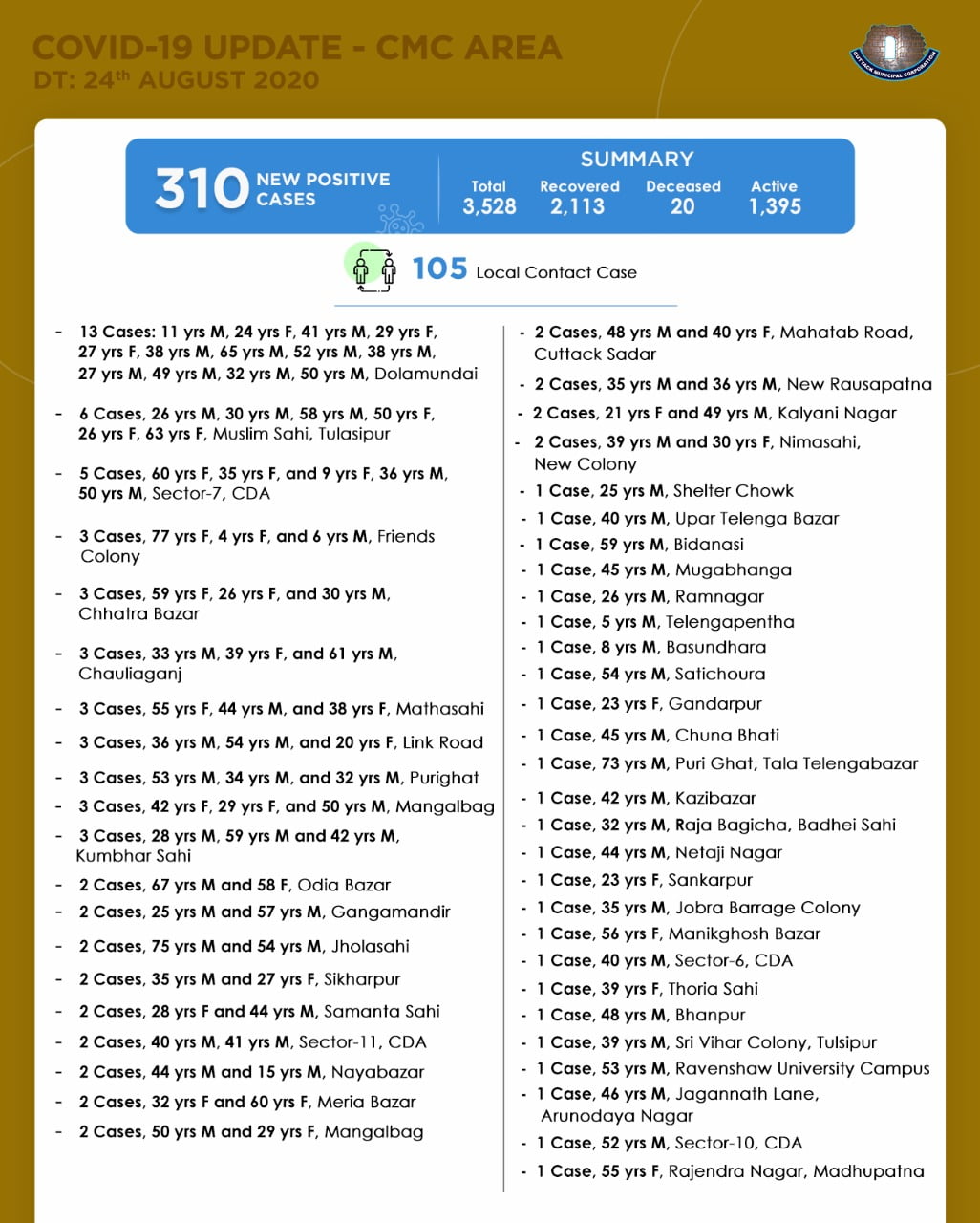 With 20 deaths and 2113 recoveries, Cuttack city now has 1395 active cases.