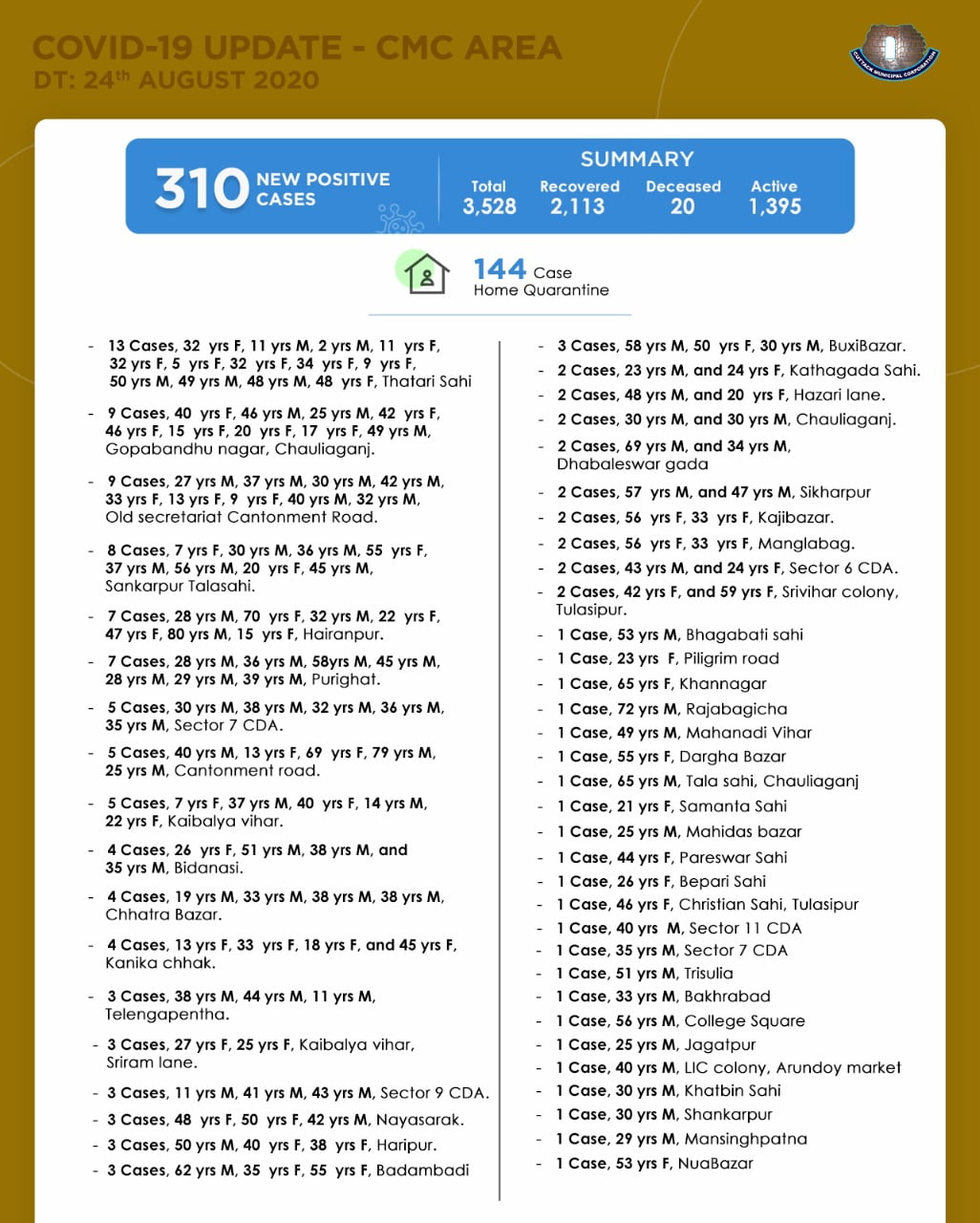 With 20 deaths and 2113 recoveries, Cuttack city now has 1395 active cases.