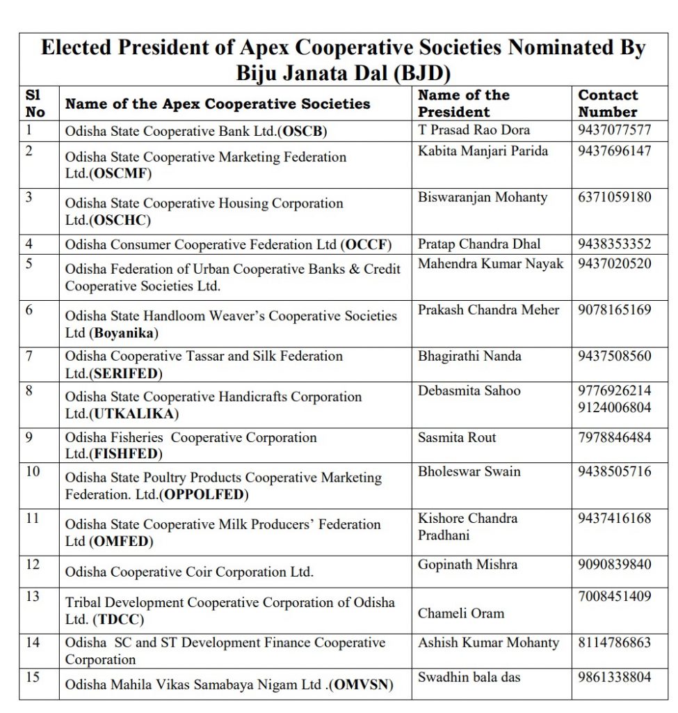Similarly, T Prasad Rao Dora is the new president of Odisha State Cooperative Bank Ltd (OSCB), Ashish Kumar Mohanty of Odisha SC and ST Development Finance Cooperative Corporation and Bhagirathi Nanda of Odisha Cooperative Tassar and Silk Federation Ltd (SERIFED).