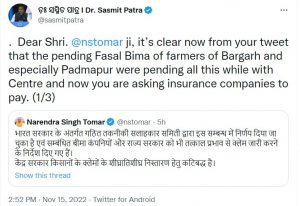 “It’s clear now from your (Tomar’s) tweet that the pending Fasal Bima of farmers of Bargarh and especially Padmapur were pending all this while with the Centre and now you are asking insurance companies to pay,” said Patra.