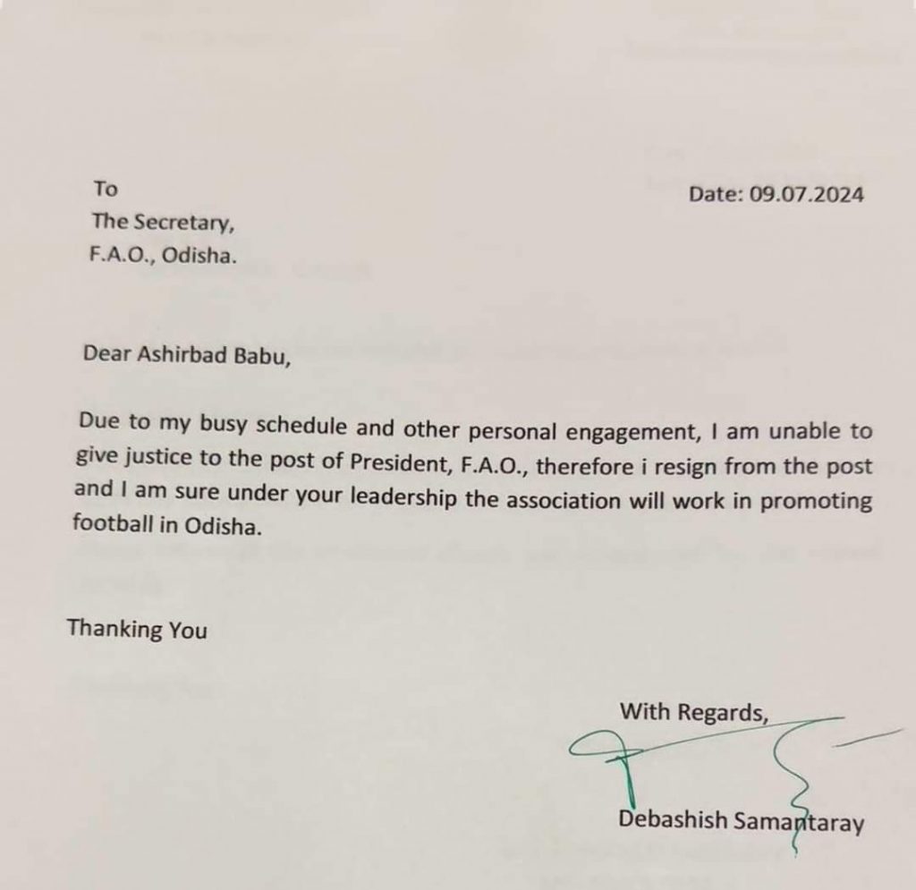 “Due to my busy schedule and personal engagement, I am unable to give justice to the post of President, F.A.O. Therefore, I resign from the post and I am sure under your leadership the association will work in promoting football in Odisha,” he said in the letter.
