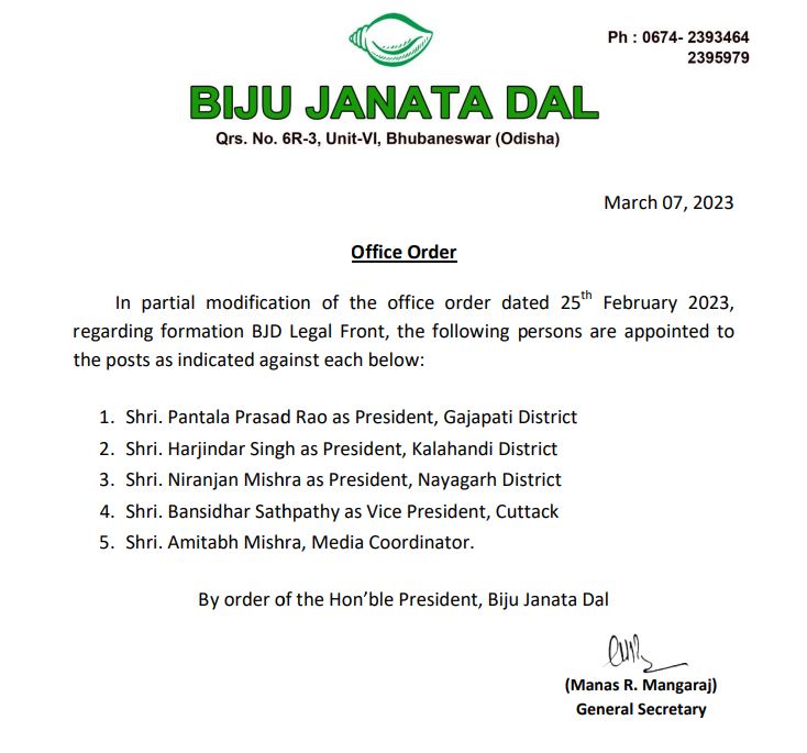 The order also stated that Bansidhar Sathpathy has been appointed as legal front vice president in Cuttack district.