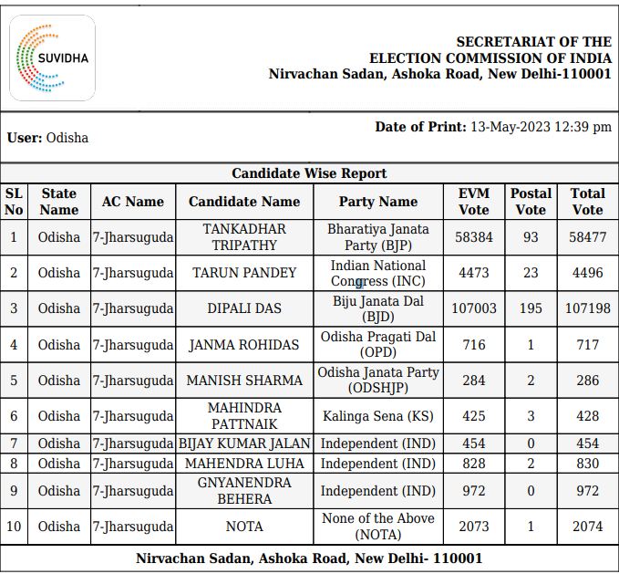 After the conclusion of all 19 rounds of counting of EVM votes and postal votes, Deepali secured a total of 1,07,198 votes while BJP nominee Tankadhar Tripathy managed to poll 58,477 votes. Congress candidate Tarun Pandey got 4496 votes.