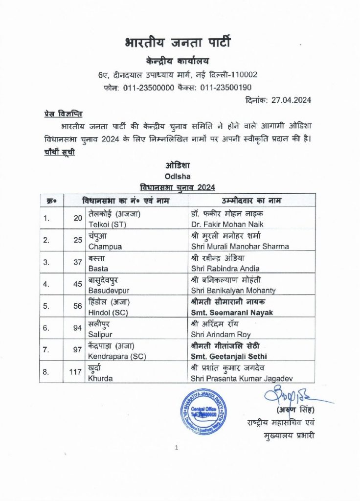 The central office of BJP in New Delhi, in a press release, said the party’s central election committee has finalised fourth list of candidates for election to Odisha Assembly.
