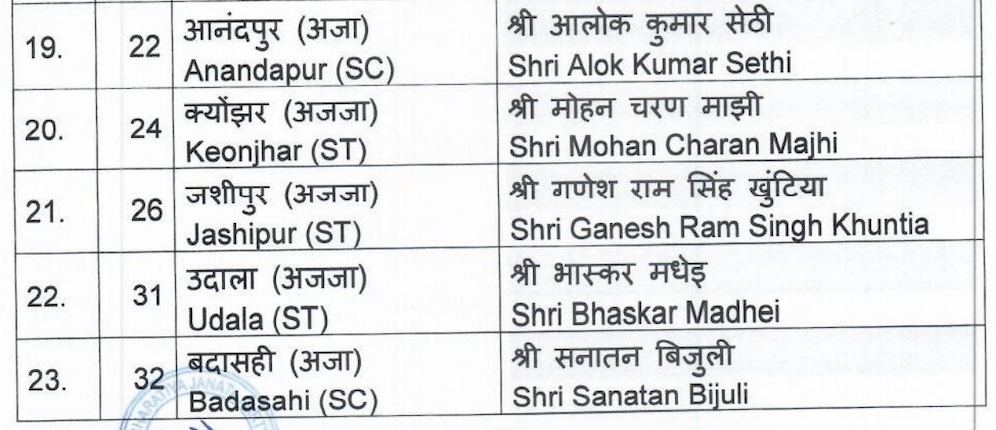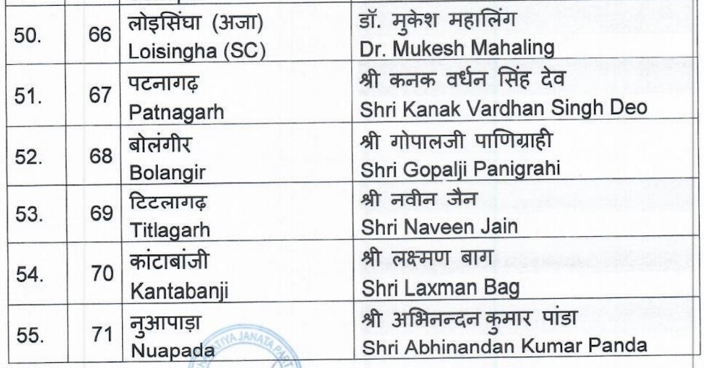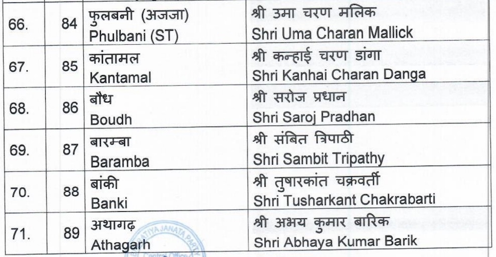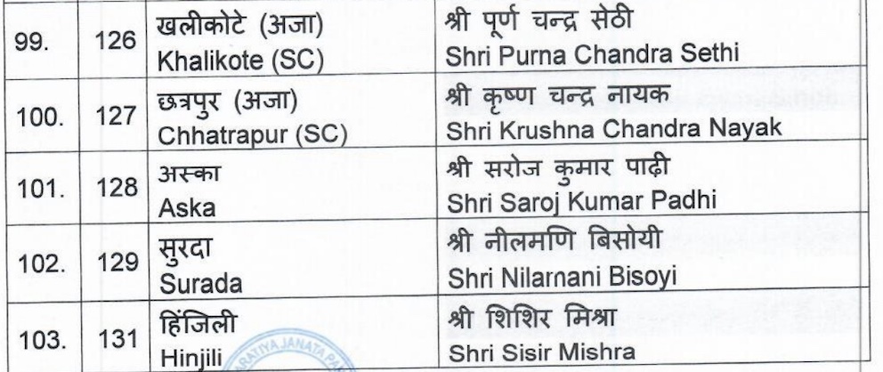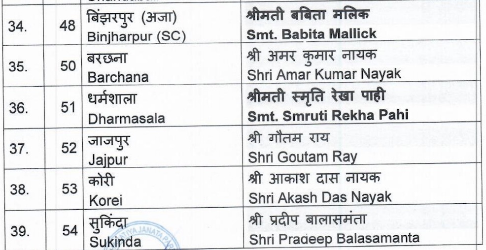 The party has instead given ticket to Abhinandan Kumar Panda, son of Basanta Panda, from Nuapada. The BJP has also fielded youth leaders Tejeswar Parida from Patkura, Irasis Acharya from Bhatli, and Tankadhar Tripathi from Jharsuguda.