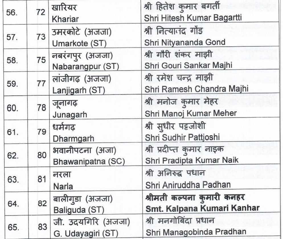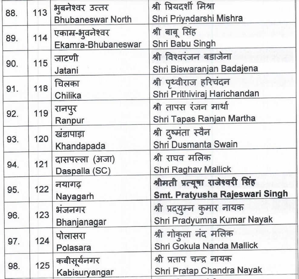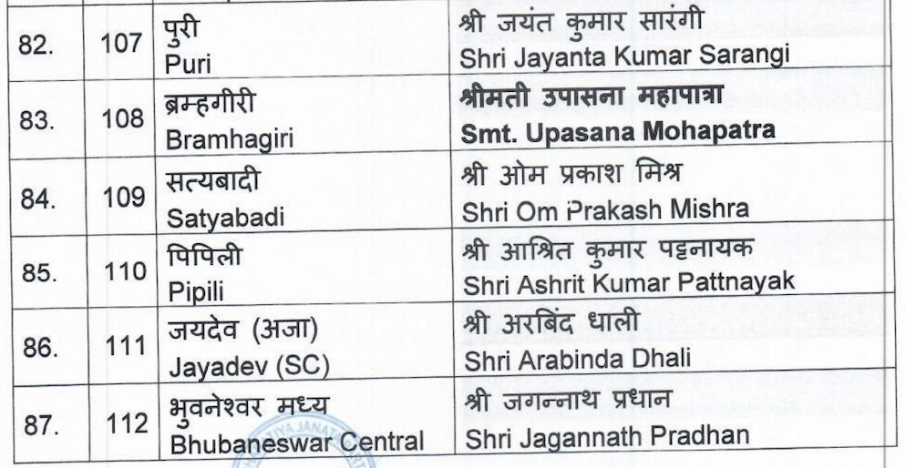 The list includes state BJP president Manmohan Samal (Chandbali), Leader of Opposition Jayanarayan Mishra (Sambalpur), Former Leader of Opposition Pradipta Naik (Bhawanipatna) and former state BJP president K V Singhdeo (Patnagarh). The saffron party has renominated most sitting MLAs except Lalitendu Bidyadhar Mohapatra for Brahmagiri, where he has been replaced by his niece Upasana, who is the daughter of former Congress heavyweight Lalatendu Bidyadhar Mohapatra.