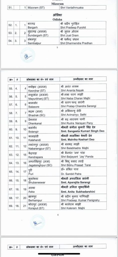 Bhubaneswar: The Bharatiya Janata Party (BJP) released its list of candidates for Lok Sabha elections in Odisha on Sunday evening.