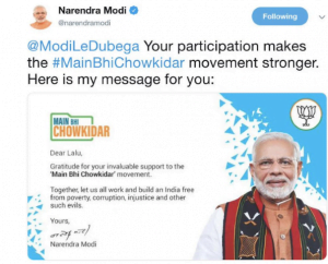 In a matter of minutes on Sunday, the message which carried a picture of the Prime Minister, his signature in Hindi and the slogan ‘Main Bhi Chowkidar’ was sent to even critics of Modi and parody accounts of the critics who had responded sarcastically to the campaign.