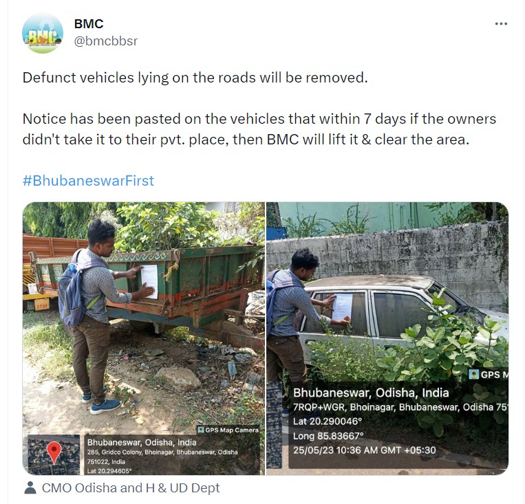 “As our efforts are on to make Bhubaneswar a clean city, we feel sorry to see some vehicle owners leaving their unused vehicles parked by the roadsides in many parts of the city. Because of this, the drains and the areas can’t be cleaned properly. Antisocial elements are also using these vehicles as their hideouts. To get the city rid of these unused vehicles, the BMC has issued the notice,” a local TV channel quoted BMC Mayor Sulochana Das as saying.