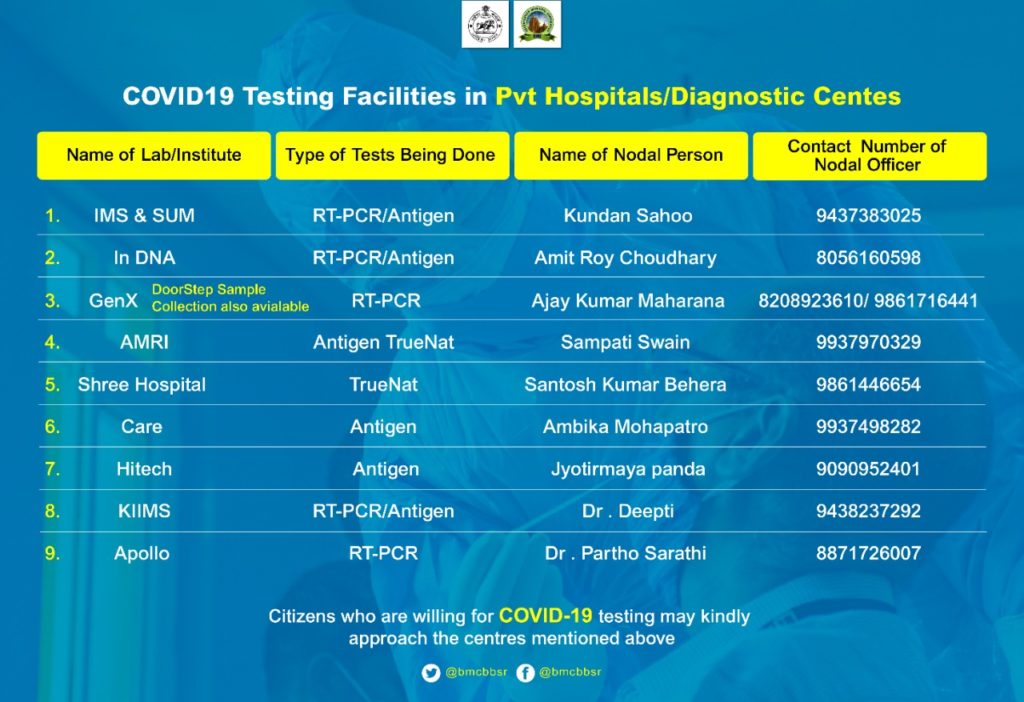 Following are the details of the testing centres released by Bhubaneswar Municipal Corporation (BMC):