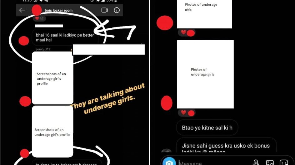 \r\n\r\nThere were lewd discussions about guessing \"sizes\" of girls and their ages.\r\n\r\nAnother disturbing message about leaking nude photos of girls:\r\n\r\n\"Bhai jitni bhi ladkiyon ne stories daali hai na sabki nudes leak kar dete hain. Kuch kuch ki hai mere paas...now they'll know yeh sab *expletive* karne ka kya natija hota hai...ab muh band rakhengi yeh *expletive*...bada feminist banna hai na sabko...kahin muh dikhane ke layak nahi rahengi.\"\r\n\r\n[Let's post nude photos of all girls who posted stories about us. I have photos of some of them. Now they will know the result of these shenanigans. They will shut their mouth. They want to be feminists na... they will not be able to show their face in public.]\"\r\n\r\n\"\"\r\n\r\nA case has reportedly been filed against the members of the group under the IT Act. However, it has not been verified.\r\n\r\nThe incident has created an uproar on social media, pointing to toxic masculinity and the promotion of rape culture at a young age.\r\n\r\n ","author":{"@type":"Person","name":"OB Bureau","url":"https://odishabytes.com/author/bureauob/","sameAs":["https://www.odishabytes.com","BytesOdisha"]},"articleSection":["India"],"image":{"@type":"ImageObject","url":"https://assets.odishabytes.com/wp-content/uploads/2020/05/bois-locker-room.jpg","width":647,"height":428},"publisher":{"@type":"NewsMediaOrganization","name":"OdishaBytes","url":"https://odishabytes.com","logo":{"@type":"ImageObject","url":"https://odishabytes.com/wp-content/uploads/2024/11/Odisha-Byyes-Logo150-min.png"},"sameAs":["https://www.facebook.com/odishabytes/","https://x.com/BytesOdisha","https://www.youtube.com/channel/UCZzaxCAclS9UoMtl51XuXkQ","https://odishabytes.com/feed/","https://news.google.com/publications/CAAqKggKIiRDQklTRlFnTWFoRUtEMjlrYVhOb1lXSjVkR1Z6TG1OdmJTZ0FQAQ?hl=en-IN&gl=IN&ceid=IN%3Aen"]},"isAccessibleForFree":true}