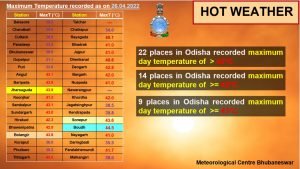 Jharsuguda recorded second highest temperature of 43.9 degree Celsius, followed by Baripada with 43.8, Soneput 43.6, Titlagarh 43.5, Angul 43.1, Sambalpur 43.1 and Sundargarh 43 degree Celsius.